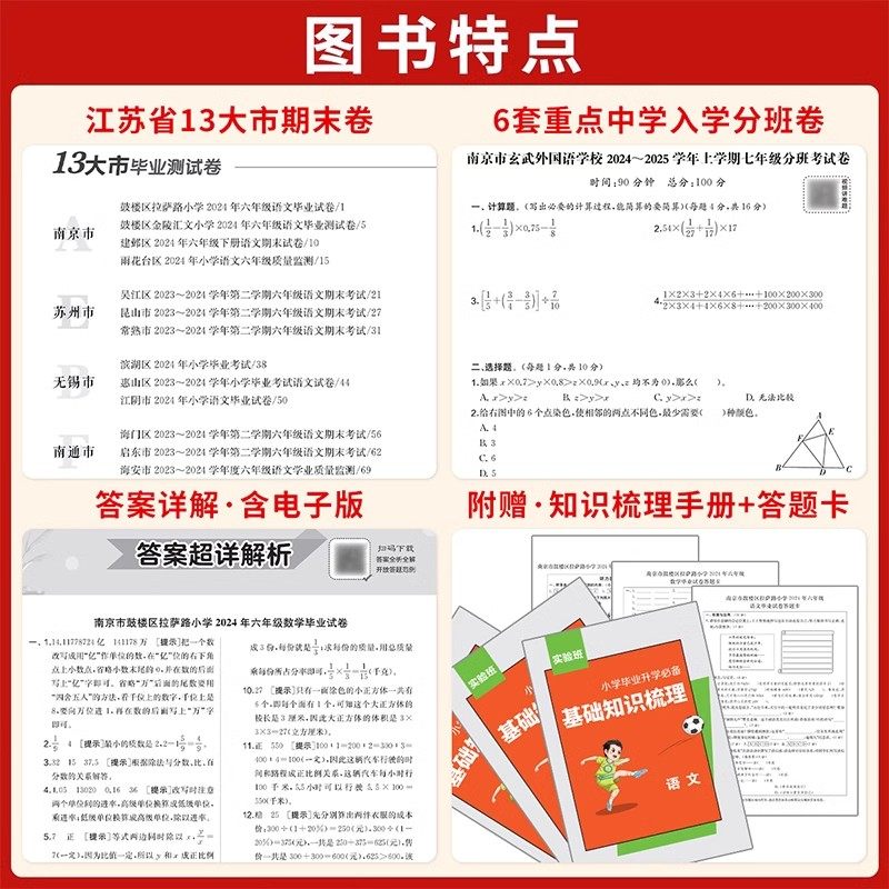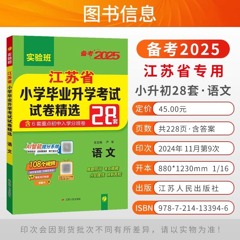 《2026新版实验班江苏省小学毕业升学考试试卷精选》专为江苏小升初考生打造,精选28套语文、数学、英语三科真题卷,紧扣苏教版教材,全面覆盖考点。试卷题型新颖、难度适中,注重基础知识与综合运用能力的结合,配有详细解析,帮助学生查漏补缺。专项训练模块强化重点难点,提升应试技巧;衔接内容助力小学到初中的平稳过渡。本书由一线名师团队精心编写,贴合江苏考情,是六年级学生系统复习、冲刺理想中学的高效备考资料,助力学子在小升初考试中脱颖而出。