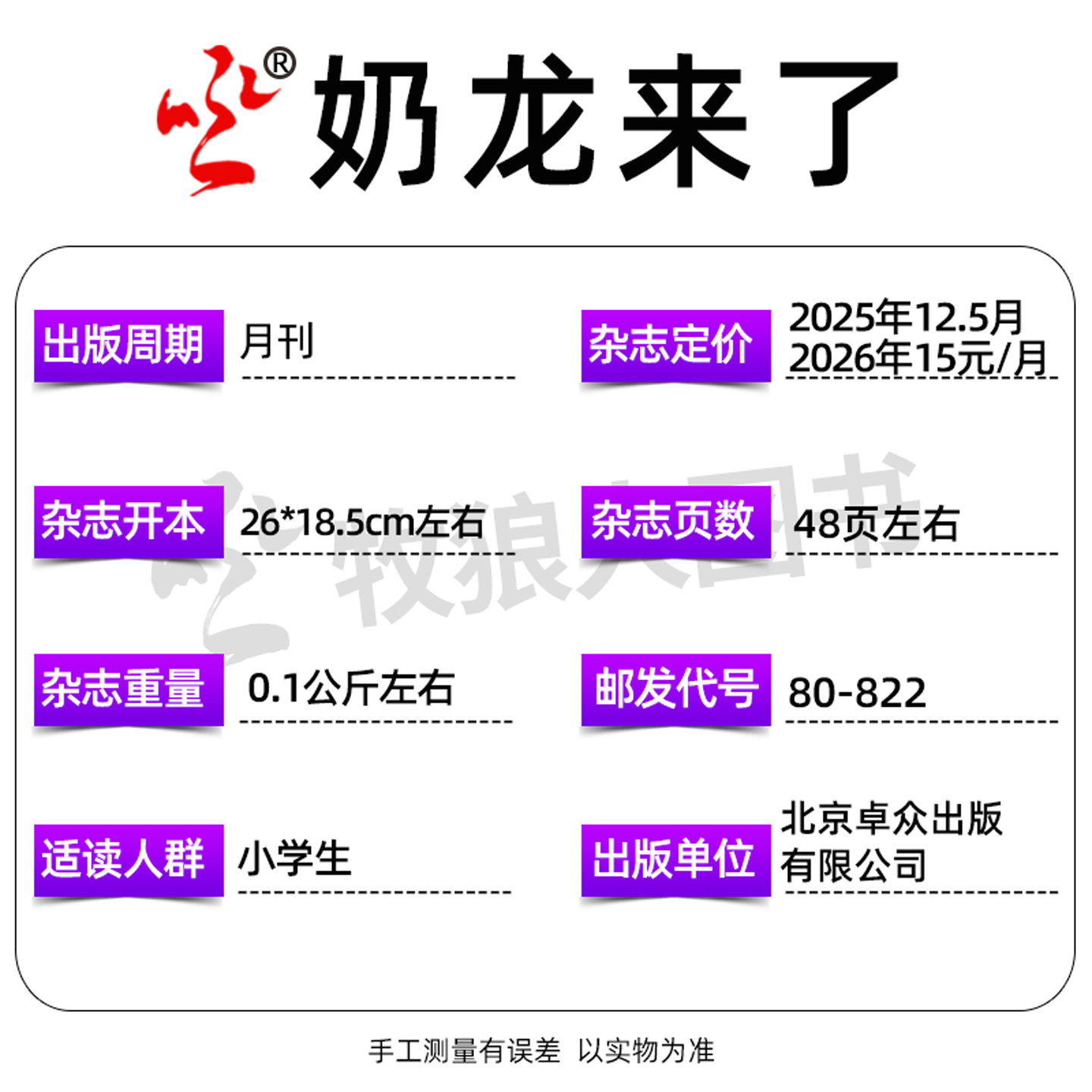 《奶龙来了》杂志2026年1-2/3月合刊,专为小学生打造的趣味科普漫画读物,融合幽默故事、逻辑推理、侦探冒险与前沿科技知识。每期以奶龙IP为主角,通过生动漫画和趣味情节,引导孩子探索科学奥秘,提升思维力与观察力。内容涵盖天文、生物、物理等百科知识,语言轻松易懂,寓教于乐。2025年全年/半年订阅用户可提前获取精选过刊,包括《好奇号》优质内容联动,拓展国际视野。适合6-12岁儿童阅读,是激发好奇心、培养科学素养的理想课外读物,让孩子在欢笑中爱上学习、拥抱未来。
