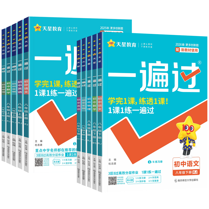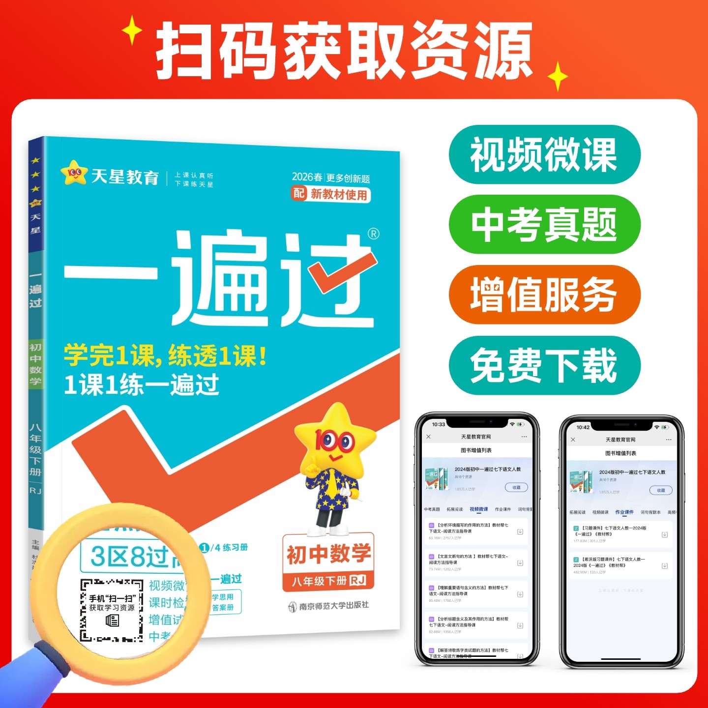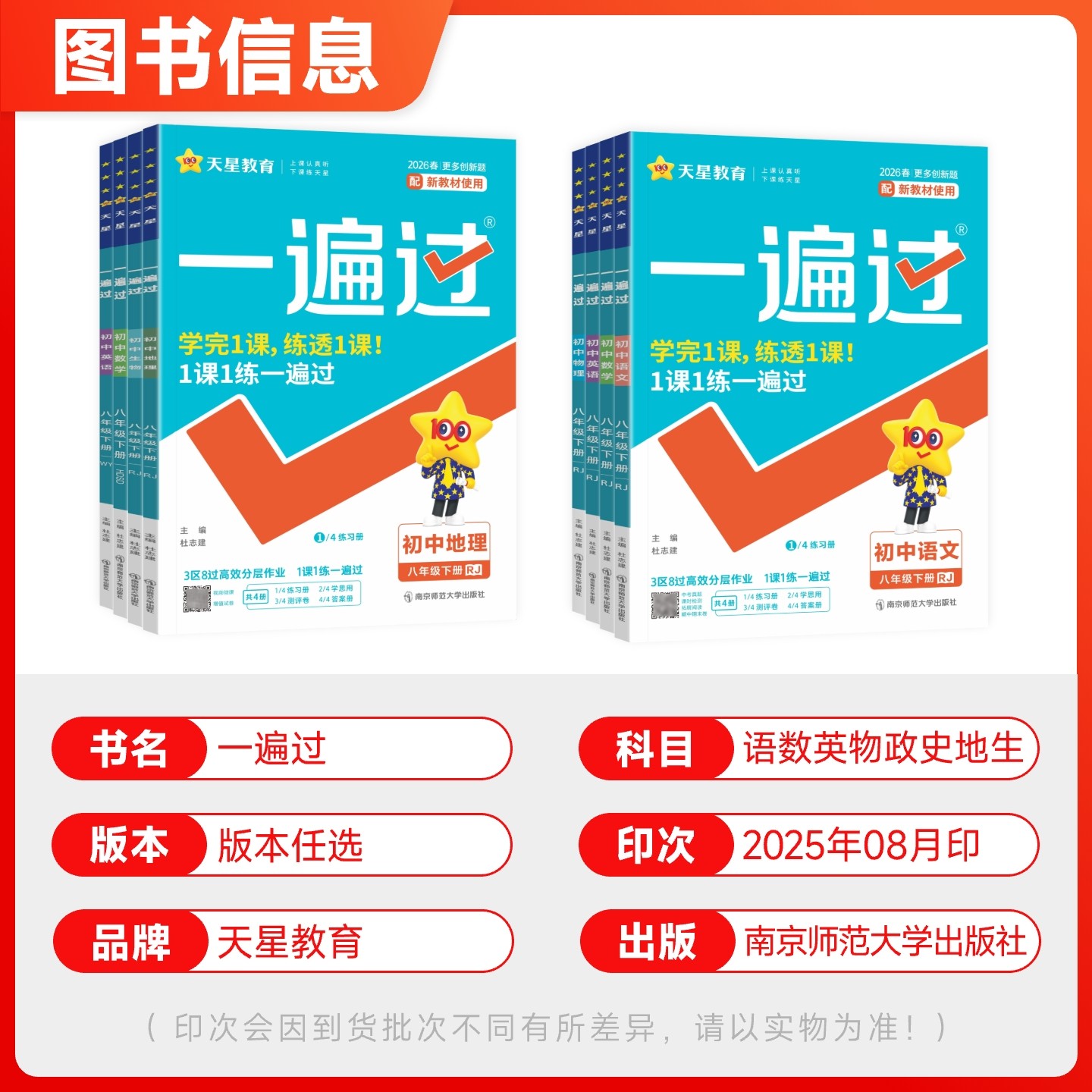 《2026春一遍过初中八年级下册语文、数学、英语、物理、政治、历史、地理、生物全套人教版(RJ)》是一套专为初二学生设计的同步训练教辅资料。本书紧扣人教版教材,涵盖八年级下册全部八大学科,内容系统全面,题型丰富,难易适中,注重基础知识巩固与能力提升相结合。每科均按课时同步编排,配有典型例题、分层练习及单元检测,帮助学生及时查漏补缺,高效掌握知识点。同时融入中考真题与模拟题型,强化应试能力。全书结构清晰,答案详解,便于自学与复习,是八年级学生夯实基础、提升成绩的理想学习伴侣。