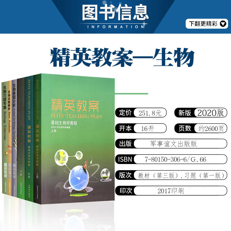 《精英教案生物教程奥赛基础生物教材+习题解析全集》是一套专为高中生物竞赛设计的高阶辅导丛书,共6册,系统覆盖细胞生物学、遗传学、生态学、分子生物学等核心模块。教材以“奥赛经典黑白配讲义”为蓝本,融合国内外竞赛真题与前沿知识,内容深入浅出,结构清晰。每章配有精选例题与详细解析,强化理解与应用能力。黑白双色印刷突出重点,提升学习效率。本书兼顾基础夯实与思维拓展,适合备战全国中学生生物学奥林匹克竞赛的学生及指导教师使用,是冲刺奥赛奖项的经典权威资料。