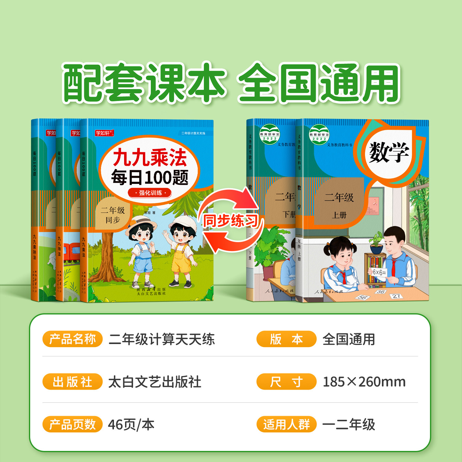 本《二年级数学九九乘法表口诀练习题》与人教版教材同步,专为小学二年级学生设计,紧扣表内乘除法核心知识点。练习册系统编排“一一得一”至“九九八十一”全部口诀,通过填空、连线、口算、应用等多种题型,帮助孩子熟练掌握乘法口诀,理解乘除互逆关系。内容由浅入深,题型丰富,注重基础巩固与计算能力提升,适合课堂练习、课后作业及家庭辅导使用。每页设有计时口算区,强化计算速度与准确率,是小学生夯实数学基础、提升运算能力的优质专项训练本。