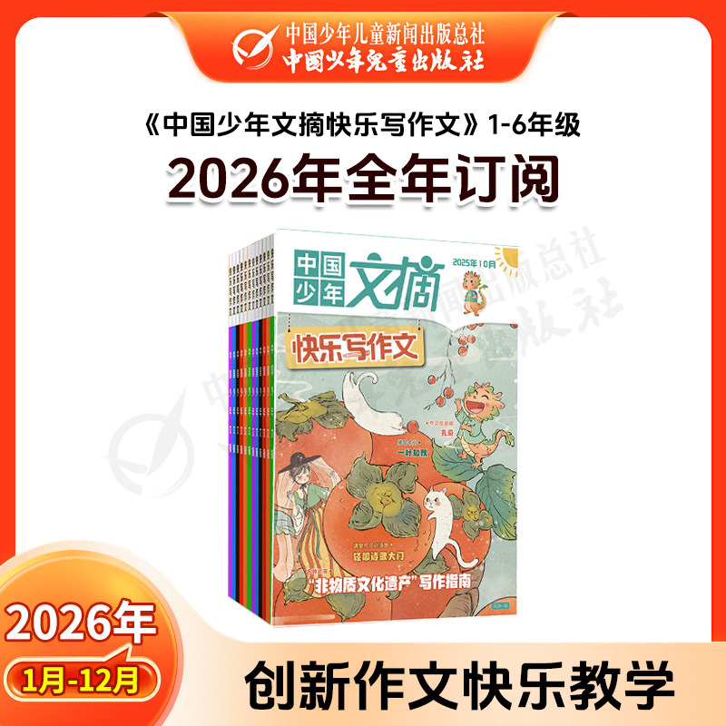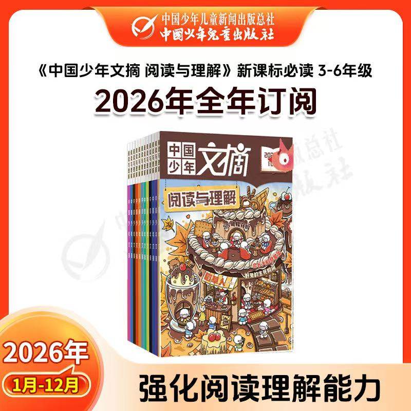 【1-2月现货】2026年全年订阅《中国少年文摘》(1-3-6年级适用,6-12岁全阶段阅读),专为小学生打造的优质期刊。注音版设计,助力低年级学生独立阅读;内容涵盖多彩语文、趣味成语故事、快乐写作指导及幽默漫画,寓教于乐,激发阅读兴趣。杂志结合课内外知识,提升语言表达与写作能力,图文并茂,生动有趣。每月一期,全年12期,陪伴孩子成长,培养良好阅读习惯。现货发售,即订即读,是家长为孩子选择的理想课外读物,让学习更轻松、更快乐!