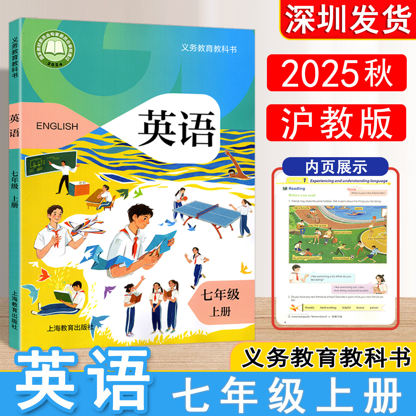 2025年秋至2025年春义务教育教科书《英语》七年级上下册(沪教版)是依据国家最新课程标准编写的新版教材,适用于初中一年级学生。本套教材由上海教育出版社出版,内容贴近学生生活,注重语言综合运用能力培养,融合听、说、读、写四项技能训练,并融入跨文化交际元素。教材结构清晰,单元主题丰富,配套数字化资源丰富,助力高效学习。本书为深圳地区正版直发,确保印刷清晰、装订牢固,支持防伪查询。适合上海及周边地区使用沪教版教材的师生选用,是七年级英语教学与学习的重要依据。