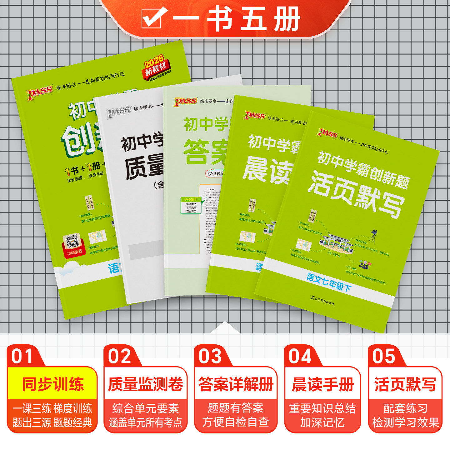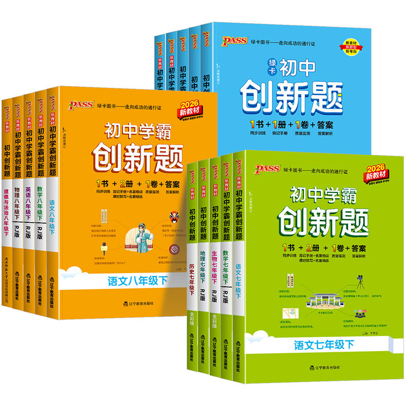 2026版《初中学霸创新题》系列同步练习册,专为七至九年级学生打造,涵盖语文、数学、英语、物理、化学、生物、历史等全学科上下册内容。本书紧扣新课标与教材重点,融合创新题型与核心素养训练,配备详尽知识讲解与解题思路点拨。精选典型例题与分层练习题,搭配单元测试与综合试卷,帮助学生夯实基础、突破难点、提升应试能力。由PASS绿卡图书精心策划,内容科学系统,编排清晰实用,是初中生高效复习、巩固提升的理想教辅资料,助力学生成为学习路上的“学霸”。