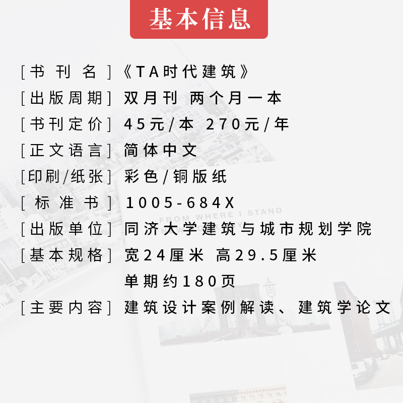 《TA时代建筑》是国内权威的建筑设计类专业期刊,聚焦全球前沿建筑理念、创新实践与学术动态。2023–2025年每年出版6期(双月刊),内容涵盖经典案例分析、新锐设计师访谈、可持续设计趋势及城市更新议题,深受建筑师、院校师生及行业从业者青睐。现开放2023、2024或2025年全年订阅(产品编号A04),下单时请备注所选年份。全年6期包邮寄送,助您系统掌握建筑领域最新发展。即刻预订,开启专业视野,把握设计未来。