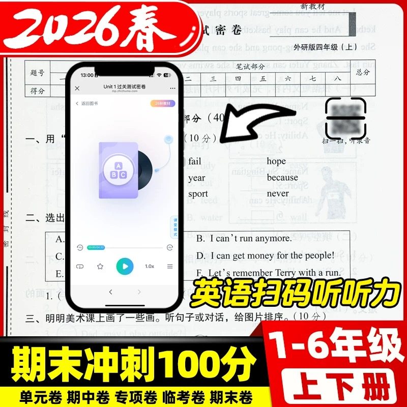 《2026春期末冲刺100分》是一套专为小学一至六年级学生设计的同步测试卷,涵盖语文、数学、英语三科,适配人教版、北师大版、苏教版、外研版、青岛版等多种教材版本,上下册齐全。试卷紧扣新课标要求,题型丰富,难度梯度合理,全面覆盖学期重点、难点与易错点,帮助学生系统复习、查漏补缺。每套试卷均模拟真实考试环境,强化应试技巧,提升综合应用能力。无论是日常练习还是期末冲刺,都能有效助力学生夯实基础、突破提升,轻松实现“100分”目标,是小学生高效复习、迎战期末的理想助学资料。