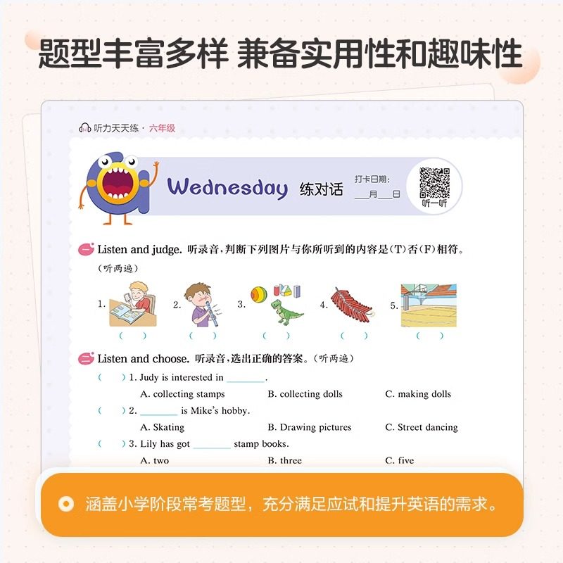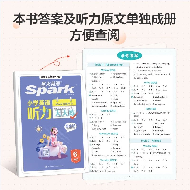 《星火英语听力天天练》是一套专为小学生设计的英语听力专项训练丛书,覆盖小学一至六年级上下册,紧扣人教版教材内容,分年级编写,难度循序渐进。本书精选贴近学生生活的听力材料,题型丰富,包括图片选择、判断正误、听音填空等,有效提升学生的听力理解能力。同时配套小升初英语阅读理解专项训练,帮助学生在巩固听力的基础上拓展阅读能力,全面提升英语综合素养。每册配有音频二维码,扫码即可收听标准发音,方便学生随时随地练习。适合小学生日常巩固、假期提升及小升初备考使用,是提升英语听力和阅读能力的实用教辅。