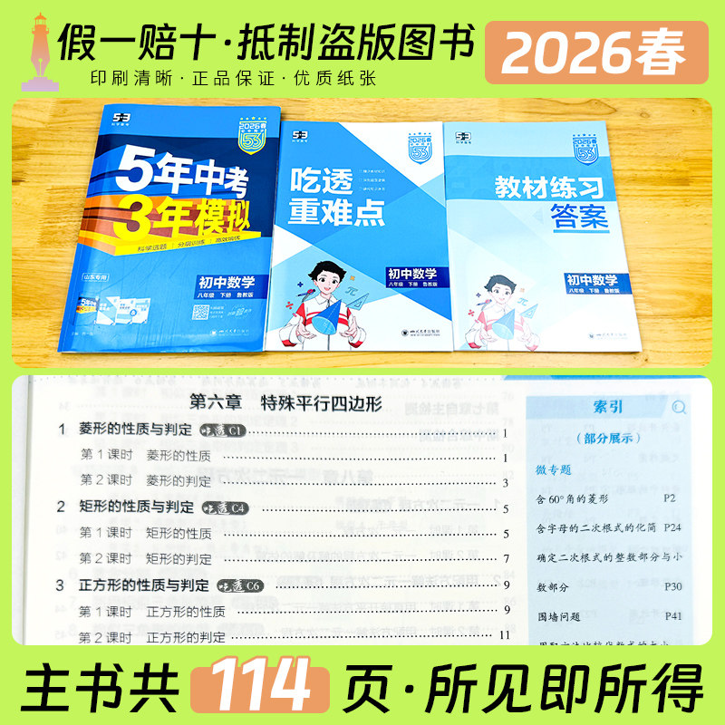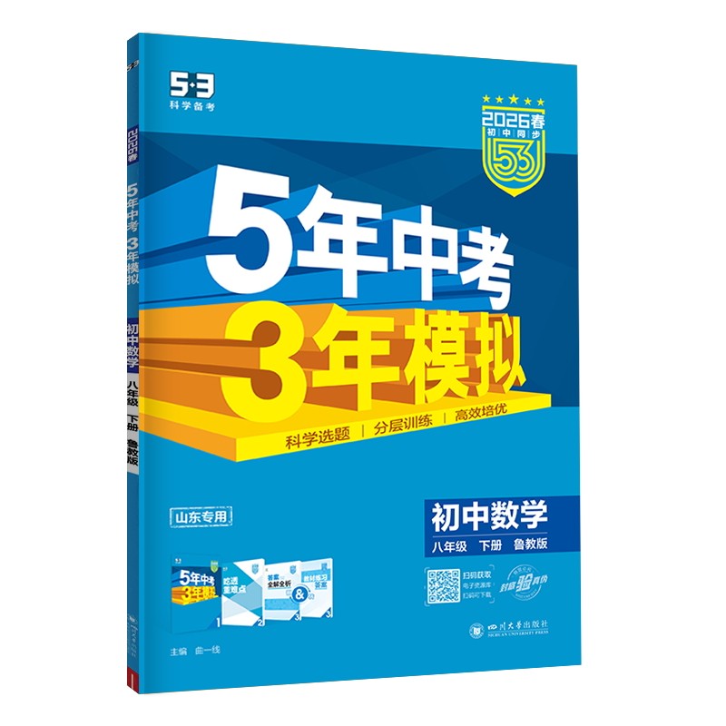 《5·3五年中考三年模拟》山东五四制专版,专为2026年春季山东地区五四学制(六至九年级)学生打造,涵盖语文、数学、英语、物理、化学、生物、地理、历史、道德与法治全学科,同步配有人教版、鲁教版、鲁科版教材版本。丛书精选近五年中考真题与三年优质模拟题,科学分层训练,夯实基础、突破重难点、提升综合能力。每册按学期分册(上下册),内容紧扣课标,讲练结合,配有详细解析,助力学生同步巩固、高效备考,是山东初中生日常学习与中考复习的优质同步练习资源。