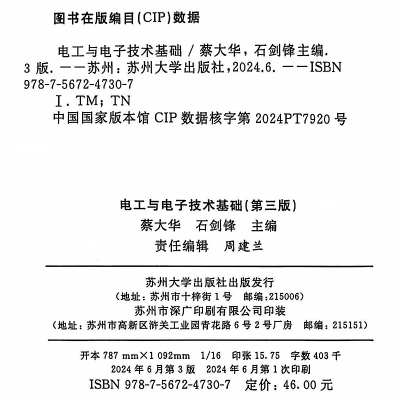 《电工与电子技术基础》(第3版)由蔡大华主编,苏州大学出版社出版,ISBN:9787567247307,是江苏省五年一贯制“专转本”考试的权威指定教材。本书在第二版基础上全面升级,内容紧扣最新考纲,系统讲解电路基础、电磁原理、模拟与数字电子技术等核心知识,注重理论与实践结合,配有典型例题、习题及解析,便于学生巩固提升。全书结构清晰、语言精炼,适合高职、高专及专转本考生使用。正版保障,全国包邮,是备考复习的理想之选,助力考生高效掌握电工与电子技术基础,顺利通过升学考试。