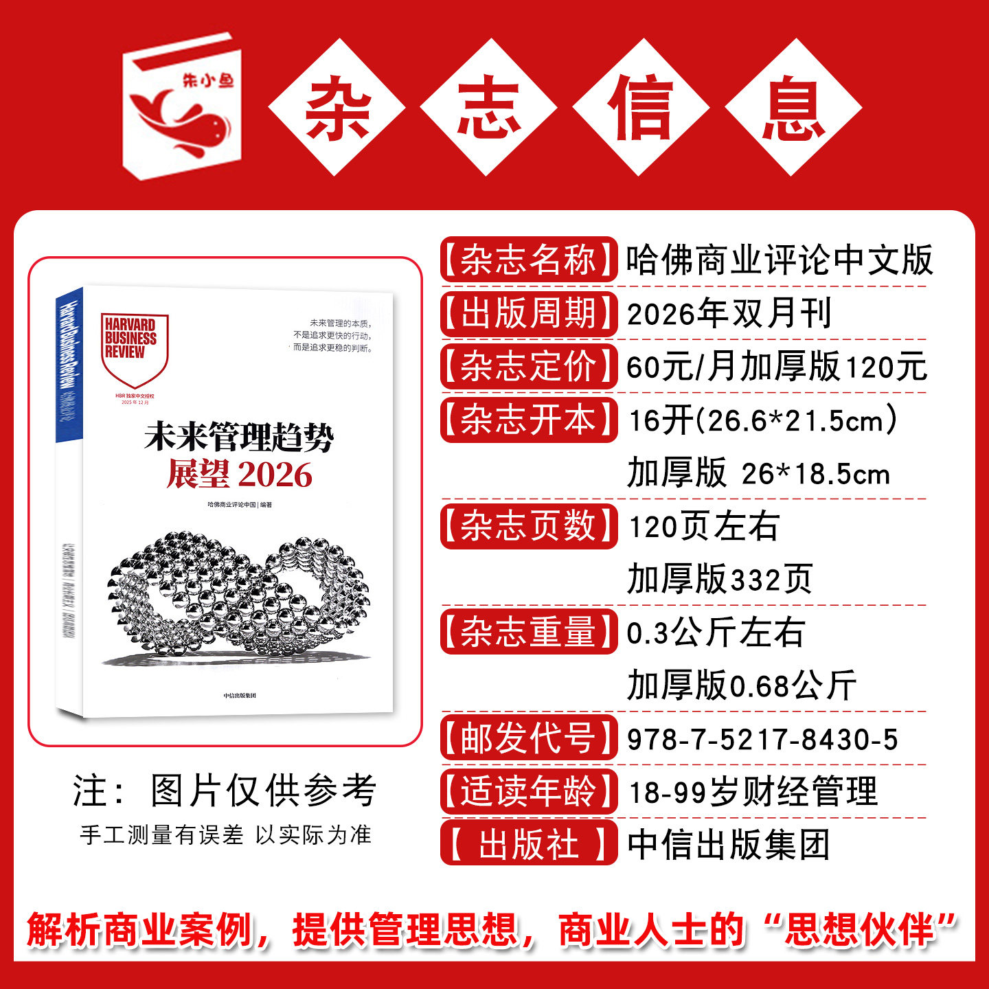 《哈佛商业评论》中文版2025年12月刊为加厚版,共332页,内容涵盖全球前沿的商业管理、战略思维、市场营销与领导力洞察。本期聚焦2025年商业趋势回顾与2026年展望,精选哈佛商学院及国际顶尖学者的深度文章,结合中国本土实践,助力管理者应对复杂商业环境。杂志同步推出2026年全年及半年订阅服务,持续提供高质量管理资讯。此外,2024年过刊亦可选购,便于系统学习经典案例与思想。作为第一财经权威引进的国际顶级商业期刊,《哈佛商业评论》中文版始终致力于推动中国商业智慧与世界接轨,是企业家、高管与学者的重要知识伙伴。