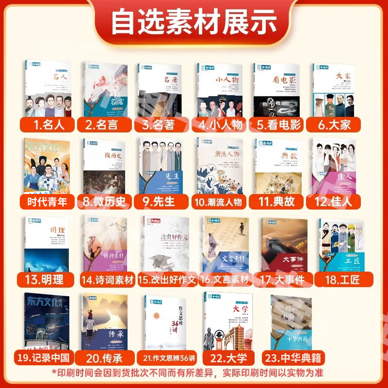 “23册”《2026语文合唱团》是一套专为高中生打造的高考语文作文素材宝典,涵盖中华典籍、小人物故事、佳人风骨、电影经典、名人轶事、先生风骨、名言金句、名著意象及大家争议等多元主题。全书精选鲜活素材,分类清晰,语言优美,兼具思想深度与时代气息,助力考生积累写作素材、提升思辨能力。每则素材均附精要点评与使用指导,适用于议论文、记叙文等多种文体,是冲刺高考满分作文的得力助手。融合传统文化与现代视野,让写作有料、有情、有魂。