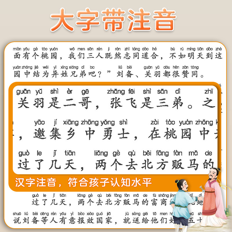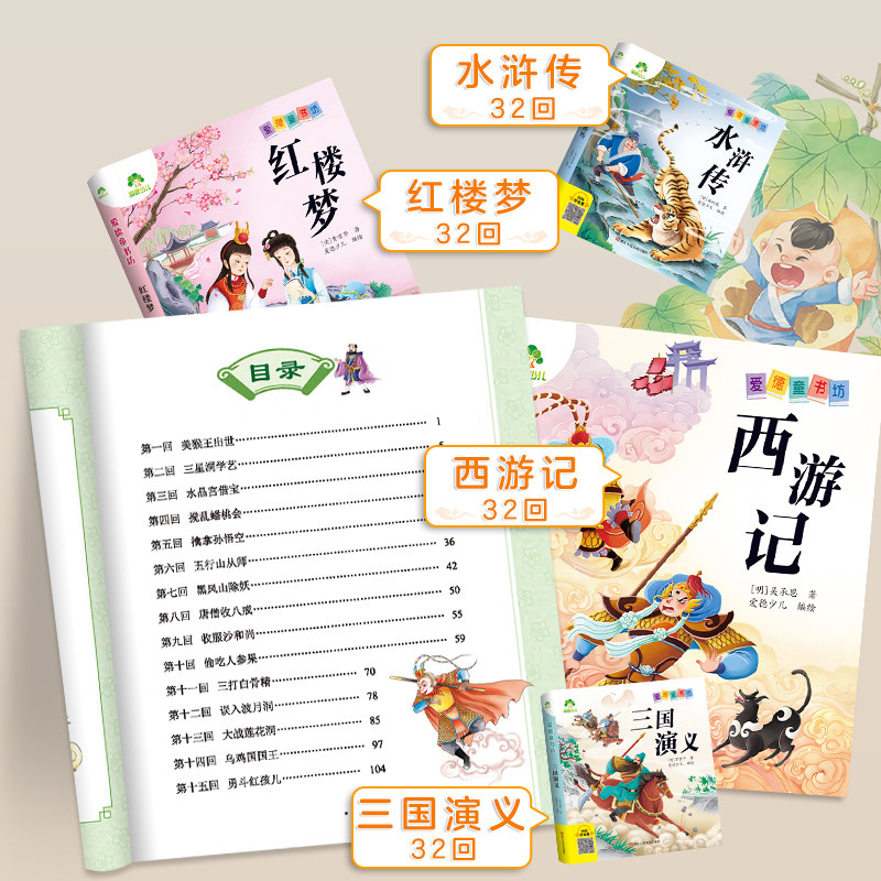 爱德少儿童书坊推出的《四大名著》小学生课外阅读系列,专为五年级学生精心打造,包含《西游记》《三国演义》《红楼梦》《水浒传》四本经典名著。全书采用彩绘插图与注音设计,图文并茂,帮助孩子轻松理解原著精髓,提升阅读兴趣与识字能力。每本书均配有扫码听读功能,专业配音朗读,助力自主阅读与语言学习。内容在尊重原著基础上进行适龄改编,语言简洁生动,情节连贯,既保留经典魅力,又符合小学生认知水平。是培养孩子文学素养、拓展课外知识的优质读本,深受师生和家长好评。