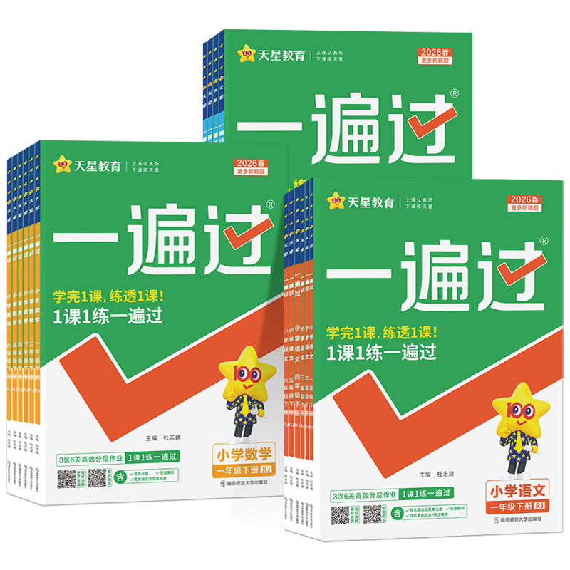 2026春新版《一遍过》小学同步训练丛书,涵盖一至六年级语文、数学、英语全学科,适配人教版、北师大版、苏教版、西师版、外研版等多种教材版本。丛书紧扣新课标要求,按课时同步设计,包含预习、课堂检测、巩固提升、单元复习等模块,题型丰富、梯度合理,帮助学生夯实基础、提升能力。每册配有详细解析,便于学生自查自纠,家长辅导。内容编排科学,题量适中,兼顾知识性与趣味性,是小学生日常练习、巩固知识的优质作业本和学测练工具,助力学生高效学习,轻松掌握课本重点难点。