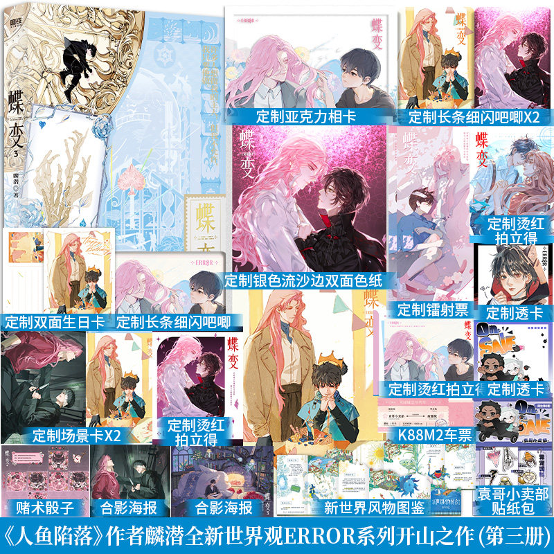 《蝶变小说实体书1-3〈人鱼陷落〉》是麟潜创作的ERROR系青春小说系列,融合科幻、悬疑与情感张力,讲述人鱼少年与特殊能力者在危机世界中彼此救赎的动人故事。本次套装附赠独家番外《礼物》与《鬼虺牙的童年》,深度补全世界观与角色背景,展现细腻情感羁绊。作品文笔流畅,设定新颖,兼具热血与温情,深受读者喜爱。实体书装帧精美,适合收藏与阅读。无论是系列粉丝还是新读者,任选单册或全套收藏,皆能沉浸于这个充满幻想与情感张力的青春世界,感受角色在命运洪流中的挣扎与成长。
