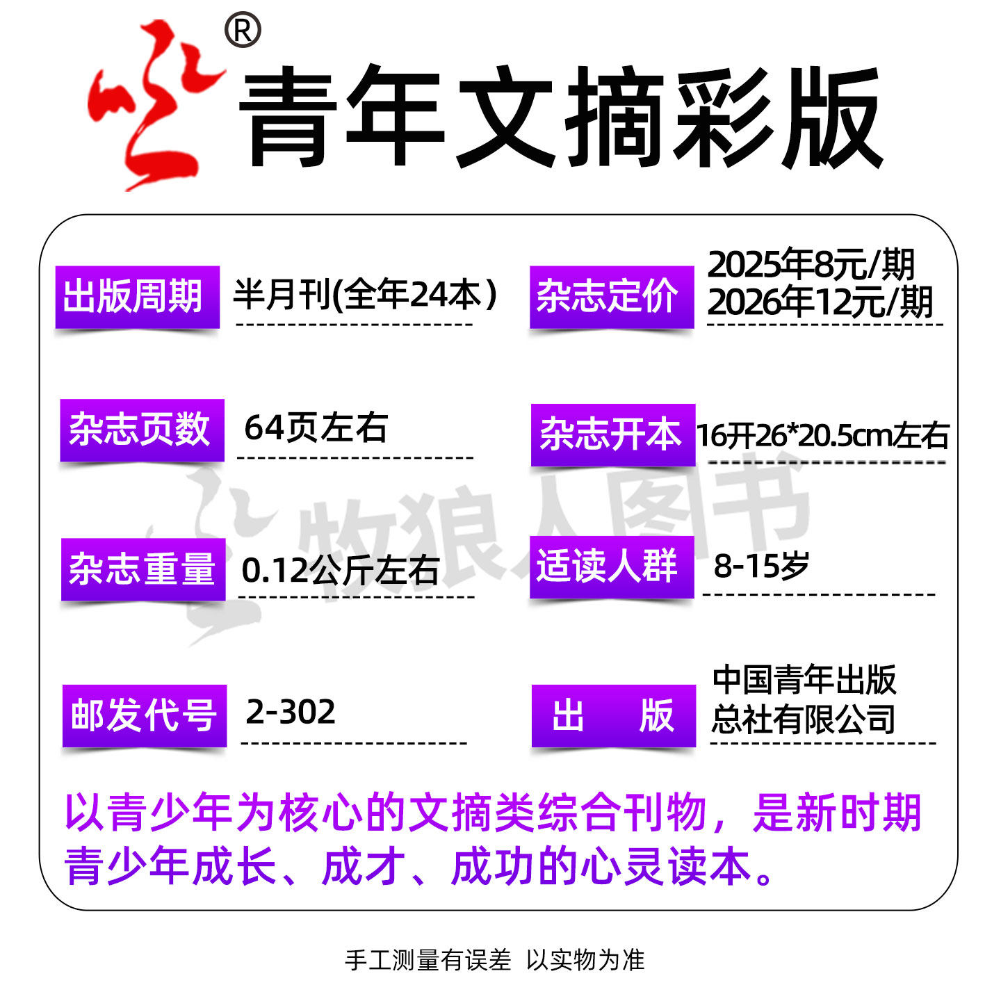《青年文摘》彩版杂志2026年1/2月1-4期,专为青少年打造,内容涵盖新知、人文、成长与校园生活,是初高中生积累作文素材、拓展视野的理想读物。本期精选热点话题、励志故事与经典美文,图文并茂,趣味性与思想性兼具。现在订阅全年或半年,即送精美图书1本、主题贴纸及2026年专属日历,超值好礼助力学习与成长。无论是课外阅读、写作提升,还是日常陪伴,《青年文摘》都是值得信赖的选择。过刊亦可收藏回味,延续阅读乐趣。让优质内容点亮青春时光!