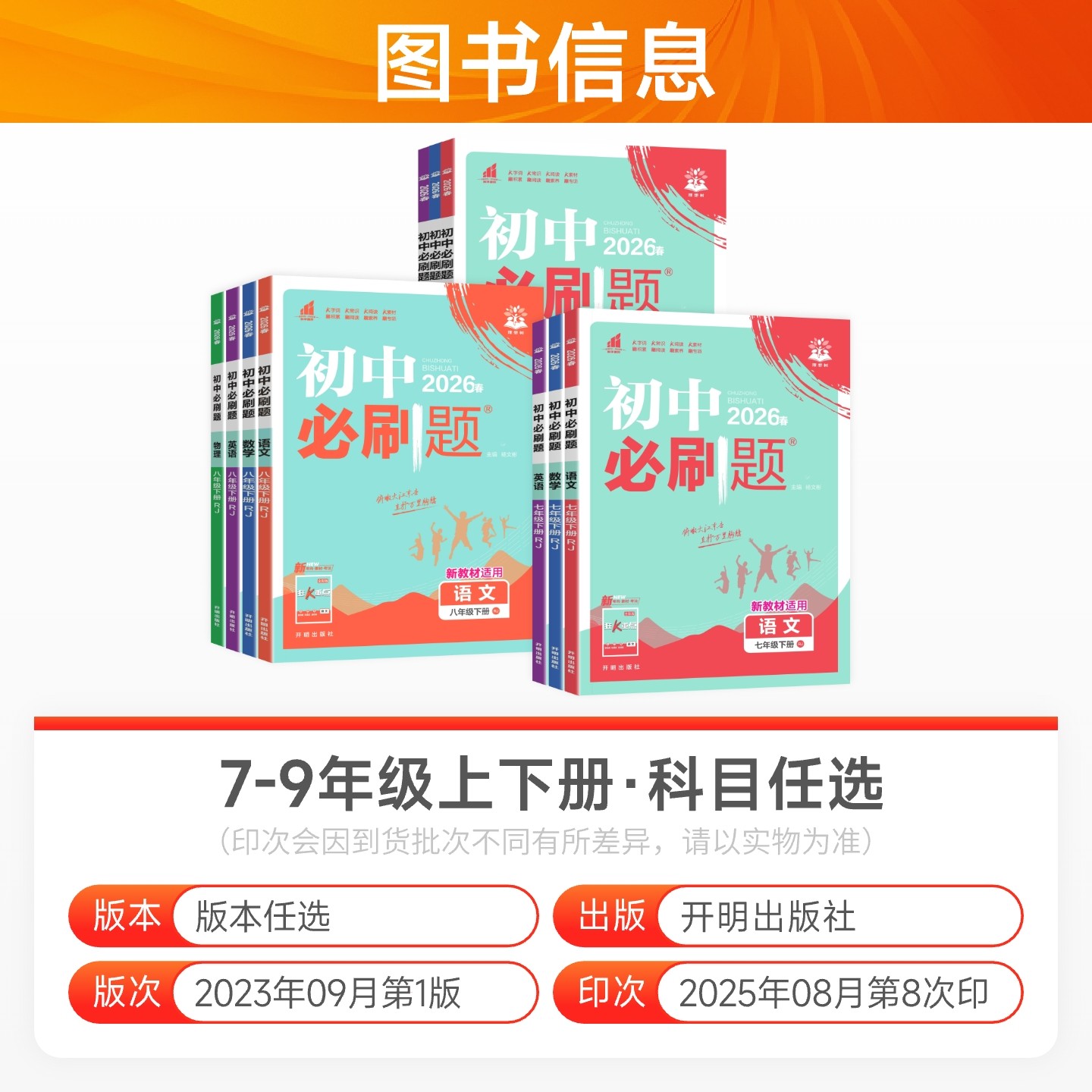 2026春《初中必刷题》系列涵盖七年级下册至九年级上册语文、数学、英语、物理、化学、政治、历史、生物、地理全科目,适配人教版、北师大版教材,专为初中生同步学习与备考设计。丛书紧扣新课标与中考考点,精选典型例题与分层练习,强化基础知识,提升解题能力。每科配备专项训练与综合测试卷,题型全面,难度梯度合理,助力学生夯实基础、突破重点难点。答案详解清晰,便于自查自纠。无论是日常巩固、单元复习,还是期中期末备考,均为高效实用的教辅资料,是初中生提升成绩的理想选择。