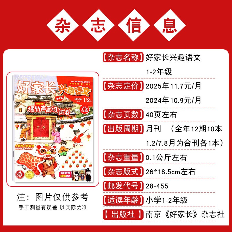 《哈博士兴趣数学》与《好家长兴趣语文》杂志2026年1-2月新刊火热订阅中!专为1-6年级小学生设计,内容紧贴课标又富有趣味性,数学注重思维训练与趣味谜题,语文融合阅读、写作与传统文化,激发学习兴趣。杂志分1-2年级、3-6年级两个版本,难度分层科学,适合不同学段孩子。现推出全年、半年及2025年补订多种选择,灵活便捷。多期可选,满足不同家庭需求。图文并茂,寓教于乐,是孩子课外学习的优质伙伴,也是家长辅导的得力助手。立即订阅,让孩子在轻松阅读中提升综合素养!