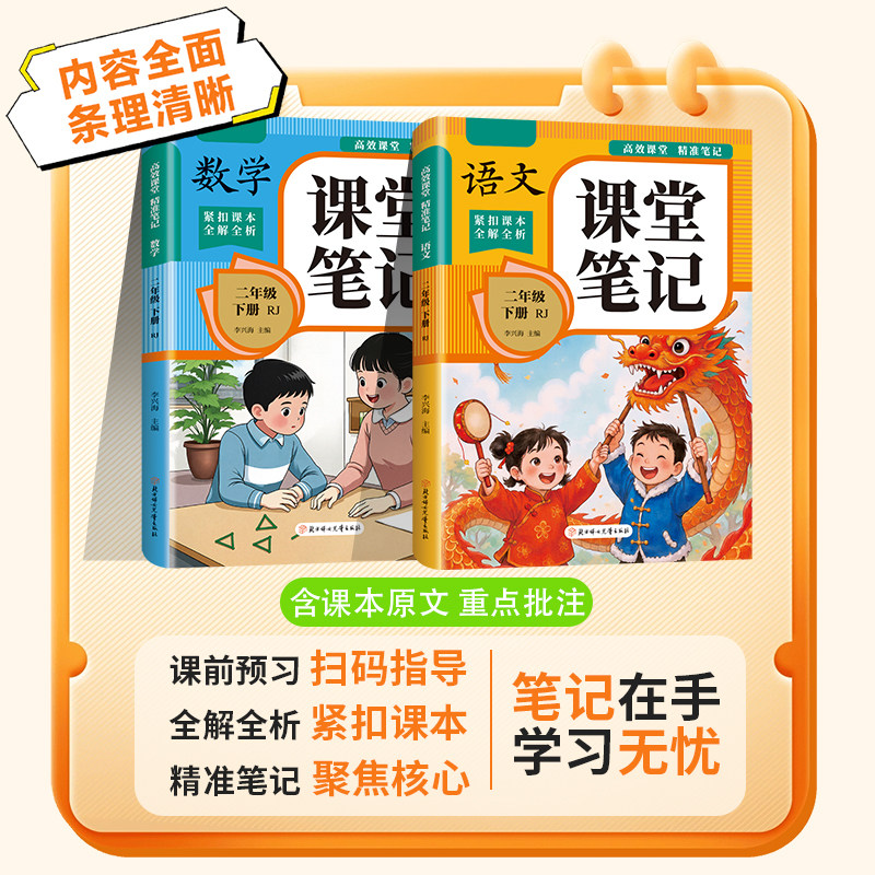 2026新版二年级下册课堂笔记(人教版)专为小学二年级下学期学生设计,紧扣人教部编版语文、数学教材,系统梳理每课重点知识、难点解析与考点归纳。内容涵盖字词积累、课文理解、数学概念、解题技巧等,搭配黄冈名师讲解与随堂练习,帮助孩子夯实基础、提升学习效率。本书兼具预习、复习与巩固功能,是寒假提前预习、课堂同步学习的优质工具书。排版清晰,图文并茂,适合家长辅导与学生自主学习,助力孩子轻松掌握课本知识,稳步提升学业成绩,是二年级学生不可或缺的学霸笔记。