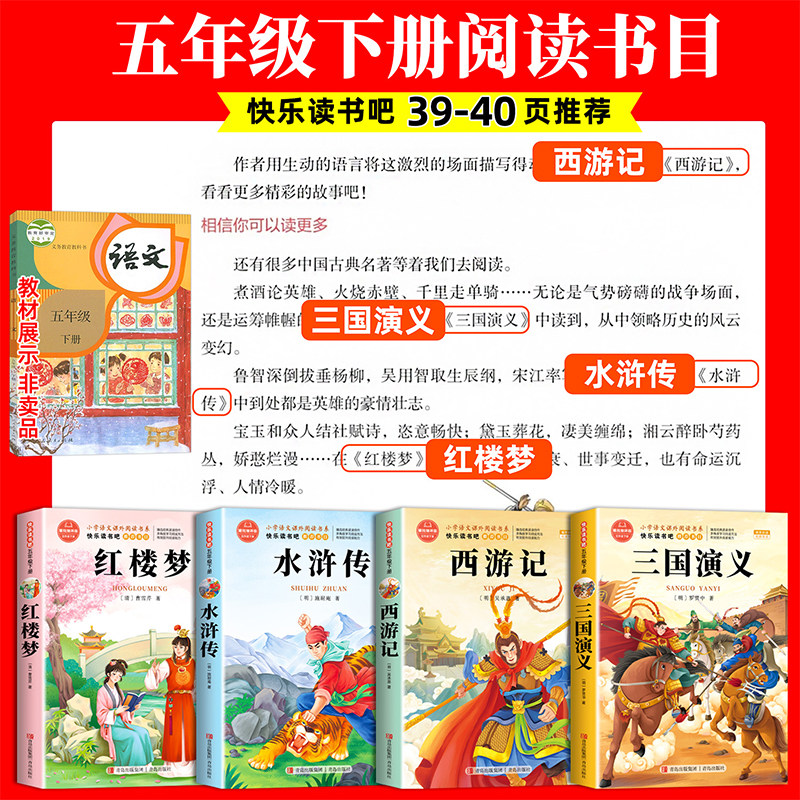 四大名著原著正版五年级下册必读正版的课外书三国演义西游记小学生版青少年版本快乐读书吧五下阅读书籍中国红楼梦水浒传全套书目