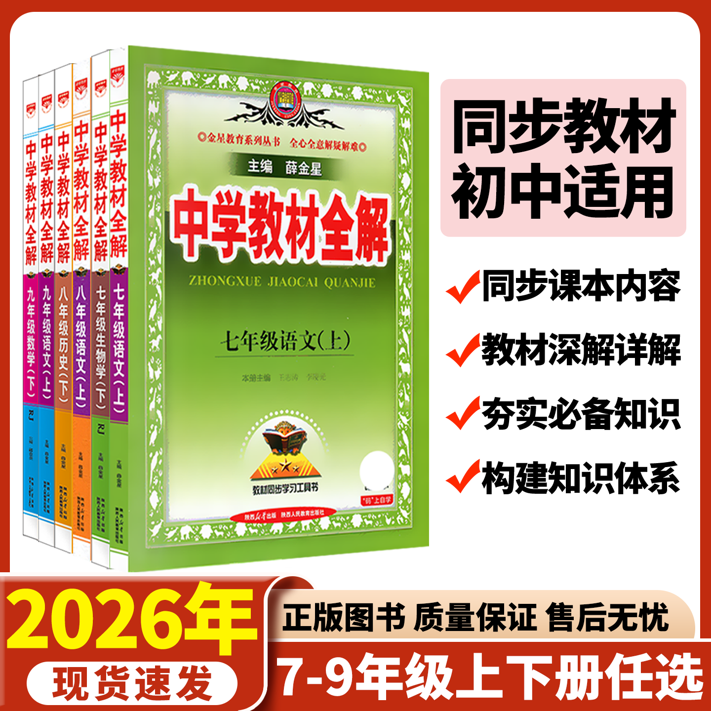 《中学教材全解》(2026春下册)由薛金星主编,是一套全面覆盖初中七至九年级主要学科的权威教辅丛书。本书紧扣人教版、部编版、北师大版、沪科版、华师大版及粤教版等主流教材,涵盖语文、数学、英语、物理、化学、生物、道德与法治、历史等科目,内容同步教材章节,注重知识梳理、重难点突破与典型例题解析。书中设置课前预习、课堂精讲、课后巩固及中考链接等模块,帮助学生夯实基础、提升能力。语言简洁明了,例题典型,解析详尽,适合初中生自主学习与教师教学参考,是提升学业水平的得力助手。