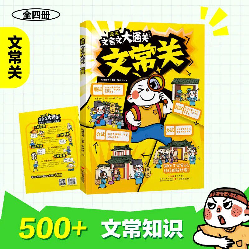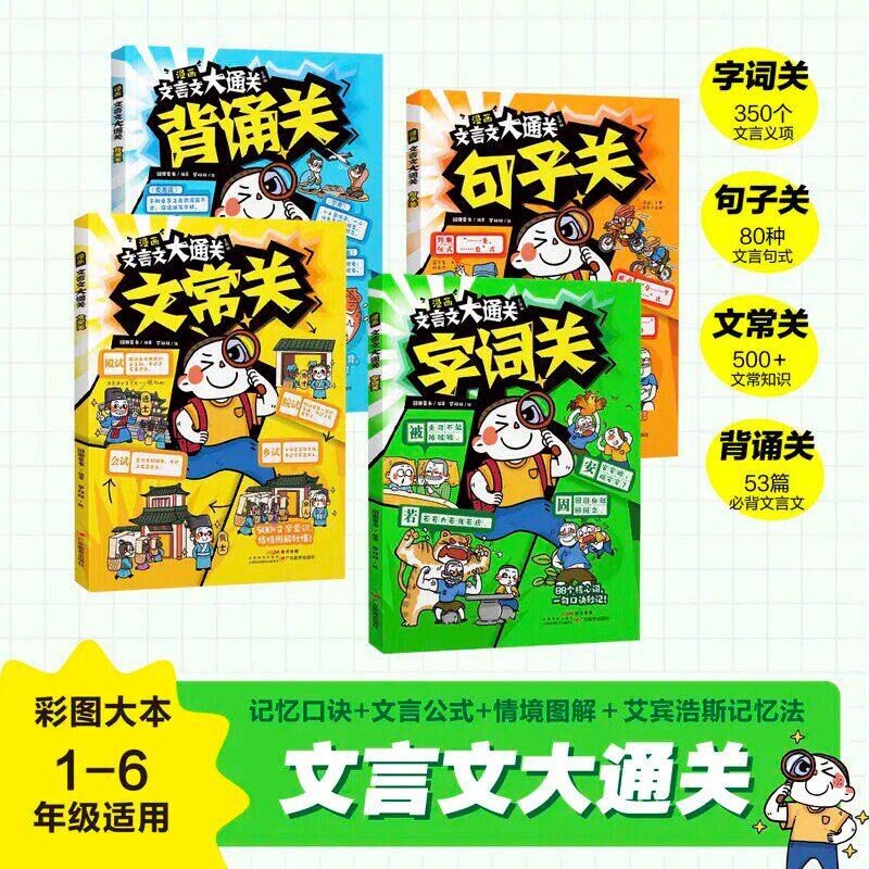 《漫画文言文大通关》全套共4册,专为小学一至六年级学生设计,将枯燥的文言文知识转化为生动有趣的漫画故事,让孩子在轻松阅读中掌握考点。书中涵盖新教材要求的经典篇目、文化常识、成语典故及重点字词解析,结合“速背口诀”和“秒懂图解”,帮助孩子快速记忆、高效学习。每册按年级梯度编排,内容由浅入深,兼顾趣味性与知识性,既是课外阅读的优质选择,也是语文学习的得力助手。通过图文并茂的形式,激发孩子对传统文化的兴趣,轻松攻克文言文难关,提升语文素养。