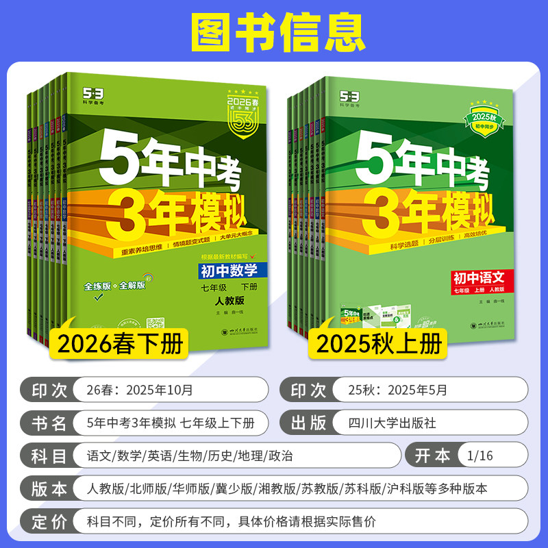 2026春秋新版《五年中考三年模拟》七年级上下册,涵盖数学、语文、英语、生物、地理、政治、历史等学科,适配人教版、北师大版、华师大版、湘教版等多种教材版本。丛书精选近五年中考真题与三年经典模拟题,紧扣新课标要求,注重基础知识巩固与能力提升。每册按课时同步编排,讲练结合,配有知识清单、考点突破、真题精练和模拟检测,帮助学生夯实基础、掌握解题技巧。适合初一学生同步学习与阶段复习,是提升综合素养、备战中考的高效教辅工具。