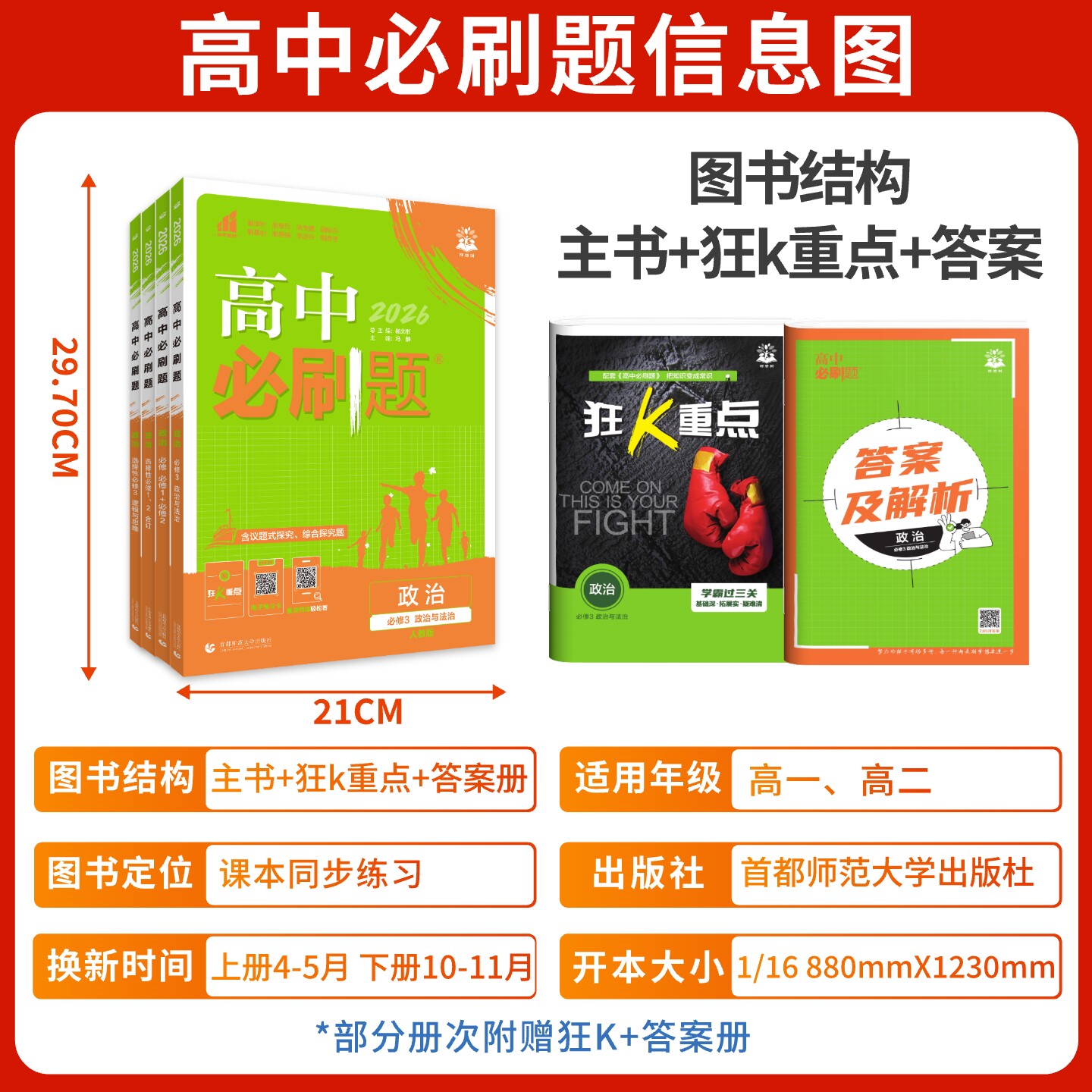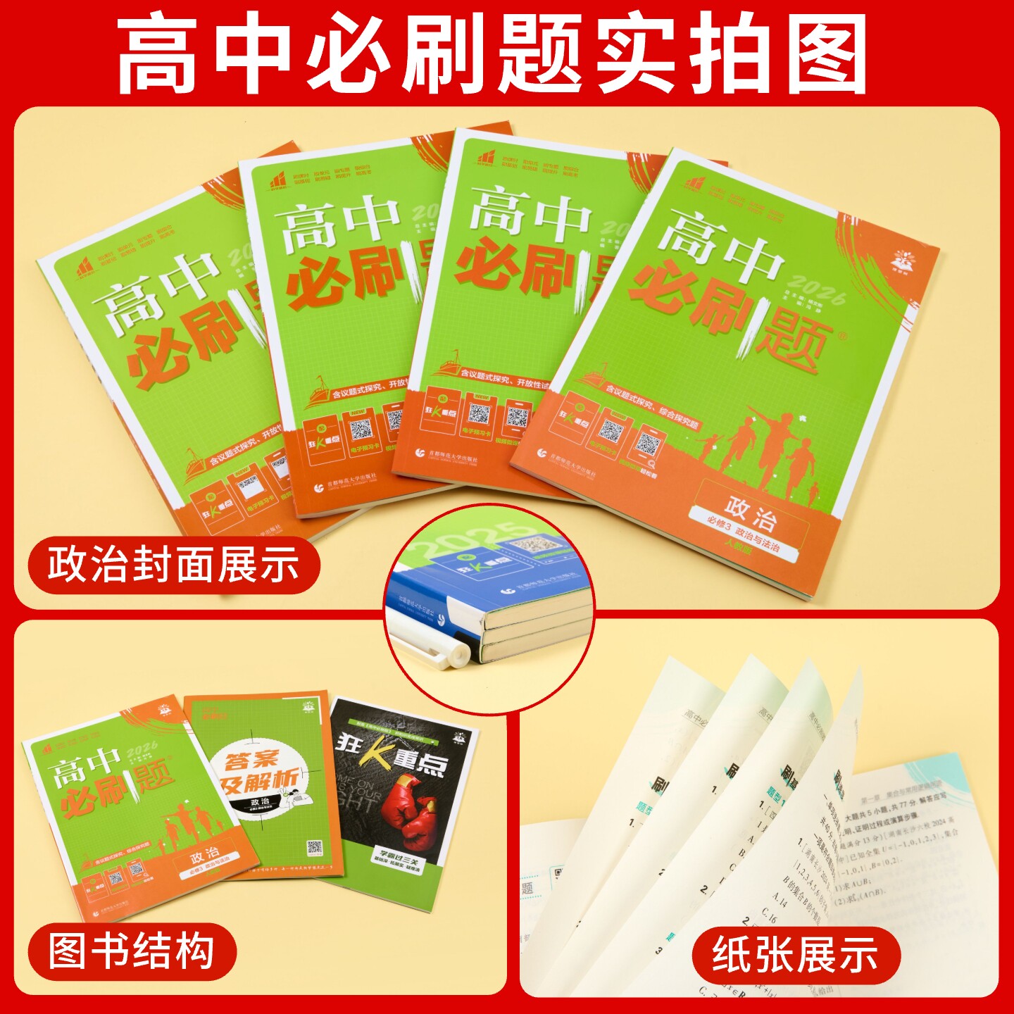 2026新版高中政治必刷题系列,紧扣人教版(RJ)教材,涵盖必修1至必修4及选择性必修1-3全部内容,同步课标要求,系统梳理知识体系。本书按题型分类强化训练,包括选择题、材料分析题、辨析题等,注重基础巩固与能力提升并重。题目设计贴近高考命题趋势,解析详尽,点拨解题思路与答题技巧。配备知识导图与易错警示,帮助学生高效突破重难点。适用于高一至高三各阶段复习与同步练习,是提升政治学科素养、备战高考的优质辅导资料,助力学生夯实基础、精准提分。
