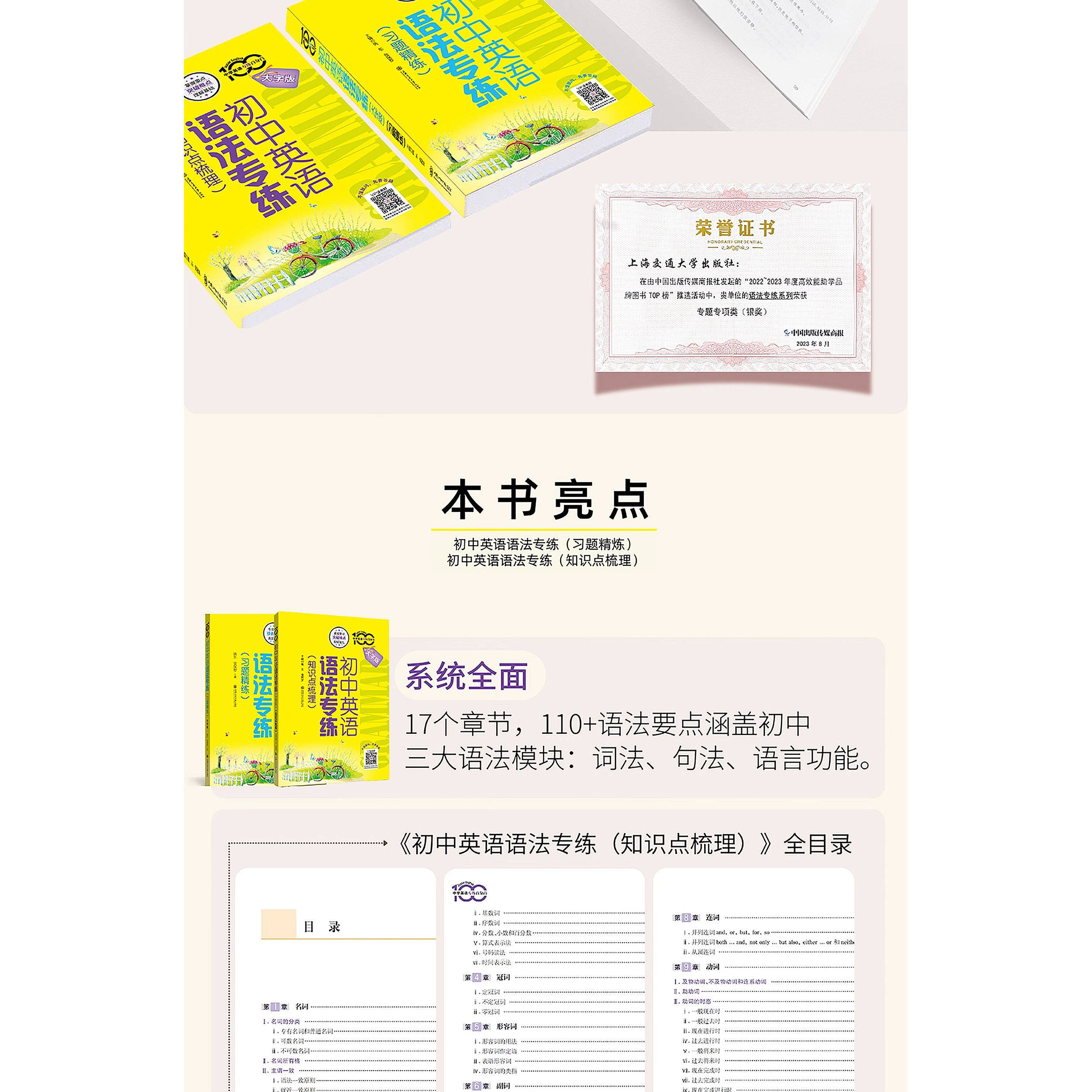 《上海版初中英语语法专练》是一本专为六至九年级学生设计的语法学习与巩固用书,紧扣上海牛津版英语教材体系,系统梳理初中阶段核心语法知识点。全书按年级分册编排,内容涵盖时态、语态、从句、词性转换等重点难点,讲解清晰简明,配以典型例句,便于理解记忆。每章后附精选习题,题型多样,包括单项选择、句型转换、完形填空等,强化知识运用能力。题目难度循序渐进,兼顾基础与提升,适合课堂同步练习与考前复习。本书注重实用性与针对性,帮助学生夯实语法基础,提升语言综合运用能力,是初中生英语学习的得力助手。