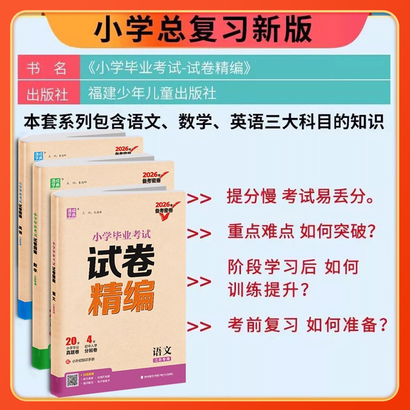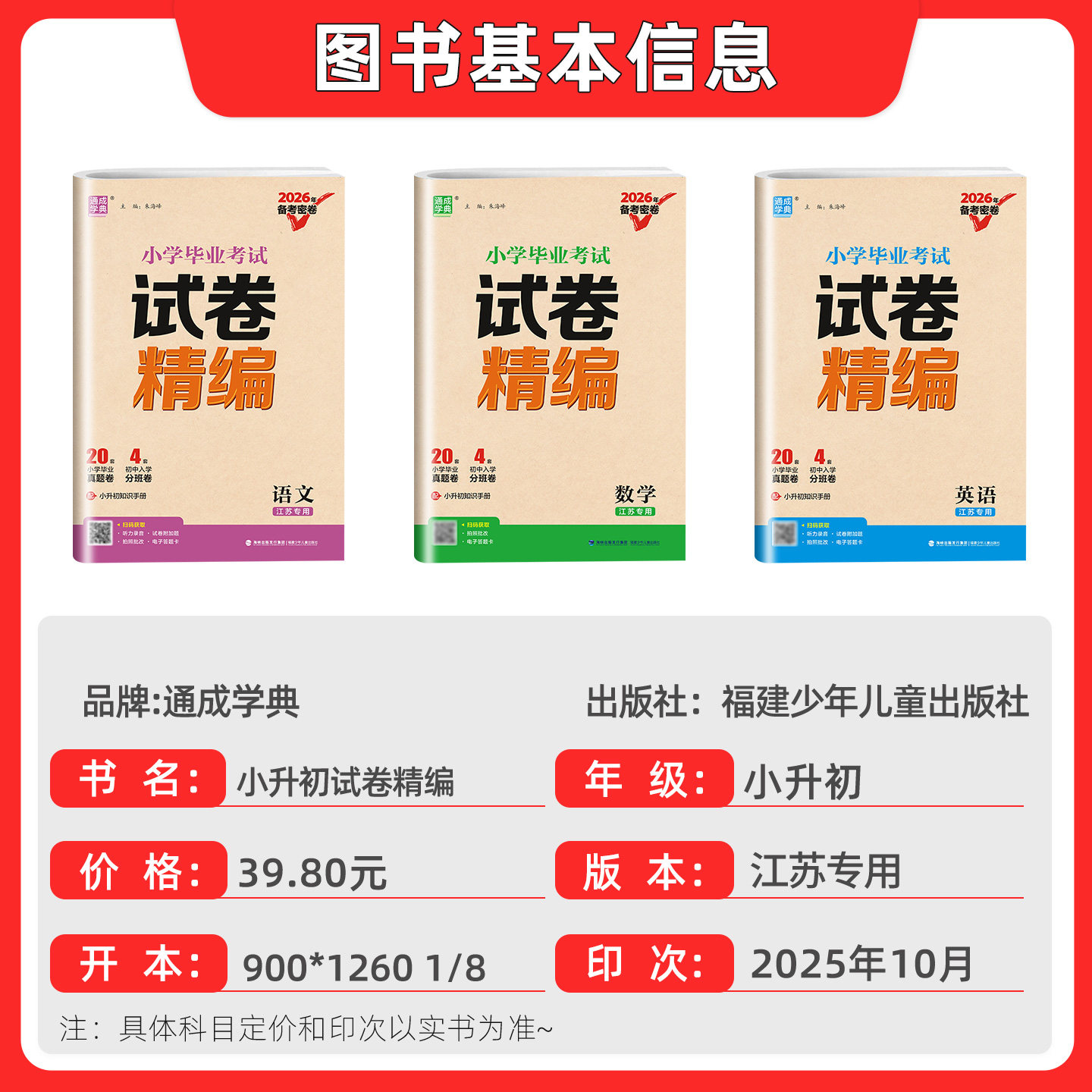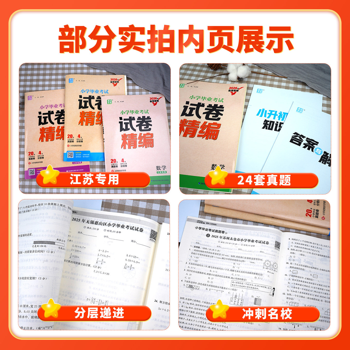 《江苏专用】小升初真题卷2026年》专为江苏省六年级学生备战小升初考试精心编写,涵盖语文、数学、英语三科,紧扣苏教版教材核心考点。试卷精选2025年最新真题及典型模拟题,题型全面、难度适中,精准对接江苏省小学毕业考试命题趋势。内含多套全真模拟测试卷与必刷密卷,帮助学生熟悉考试节奏,强化知识运用能力。每套试卷均附详细解析,便于查漏补缺,提升应试技巧。是六年级学生系统复习、高效提分的权威备考资料,助力考生顺利升入理想初中。