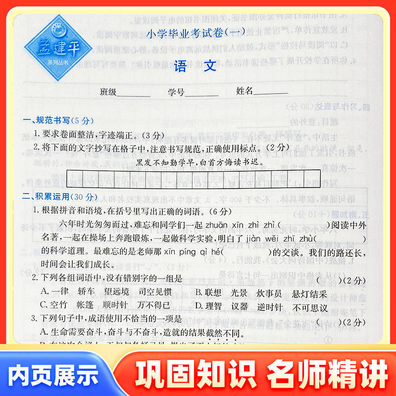 2025新版《孟建平小学毕业考试卷》系统总复习资料,专为六年级学生小升初备考设计。本套试卷涵盖语文、数学、英语、科学四科,紧扣人教版教材,精选历年真题与典型题型,全面覆盖小学阶段核心知识点。通过专项训练与期末模拟卷相结合的方式,帮助学生查漏补缺、巩固基础、提升应试能力。试卷结构科学,难易适中,配有详细解析,便于学生自测与家长辅导。无论是日常复习还是考前冲刺,都能有效助力学生系统梳理知识体系,从容应对小升初考试,是六年级学生高效复习的理想选择。