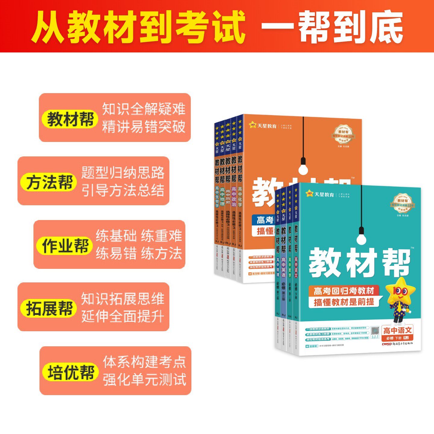 《教材帮》是天星教育推出的高中同步学习教辅系列,涵盖2026年高一、高二数学、物理、化学、生物必修一及语文、英语、政治、历史、地理选择性必修1–4册。该书紧扣新课标与教材内容,系统梳理知识点,突出重点难点,配有典型例题与分层训练,帮助学生夯实基础、提升能力。讲解深入浅出,注重思维引导与方法归纳,融合高考真题与原创题,强化应试技巧。每册均设课前预习、课堂精研、课后巩固、章末总结等模块,适合学生同步学习与教师教学参考,是高中生高效学习的得力助手。