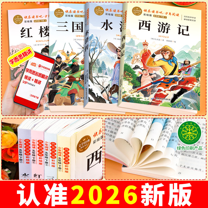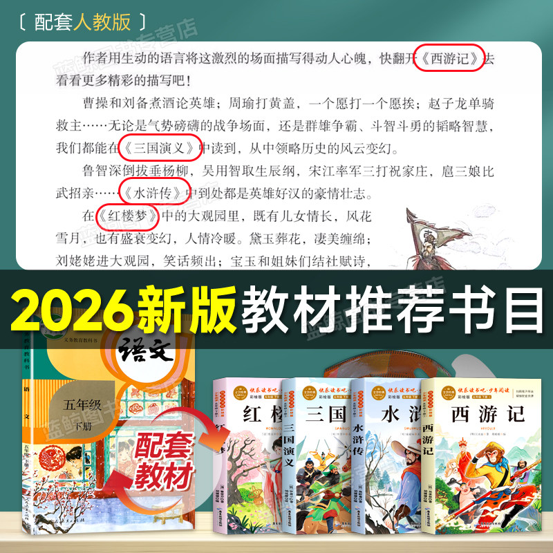 《四大名著》是中国古典文学的巅峰之作,包括《红楼梦》《水浒传》《西游记》《三国演义》,是五年级下册“快乐读书吧”推荐的必读课外书。本套书为原著完整版,语言通俗,适合小学生阅读,由人民教育出版社出版,权威正版,深受老师和家长推荐。通过阅读,孩子们不仅能感受精彩的故事情节和鲜明的人物形象,还能提升语文素养,了解中华优秀传统文化。《红楼梦》展现家族兴衰,《水浒传》讲述英雄聚义,《西游记》充满奇幻冒险,《三国演义》描绘智勇权谋。全套书图文并茂,注释清晰,是小学生拓展阅读、积累写作素材的绝佳选择,助力语文学习,启迪智慧成长。
