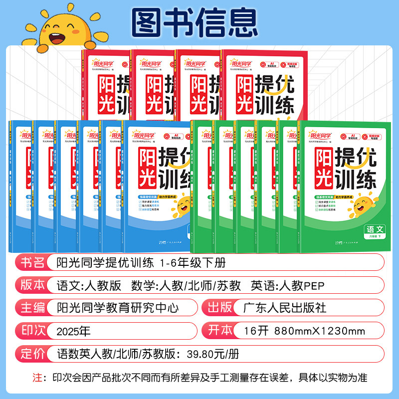 2026春新版《阳光同学课时提优训练》是一套专为小学1-6年级学生设计的同步培优练习册,涵盖语文、数学、英语三科,适配人教版、北师大版、苏教版等主流教材版本。本书紧扣新课标要求,按课时编排,题型丰富,难度分层,注重基础知识巩固与能力提升相结合。每课设有“基础练”“提优练”“拓展练”等环节,帮助学生夯实课本知识,拓展思维,提升综合素养。题目设计贴近生活,趣味性强,配有详细解析,便于学生自主学习和家长辅导。是小学生课前预习、课堂巩固、课后复习的理想助学资料,助力学生稳步提优,轻松应对学业挑战。
