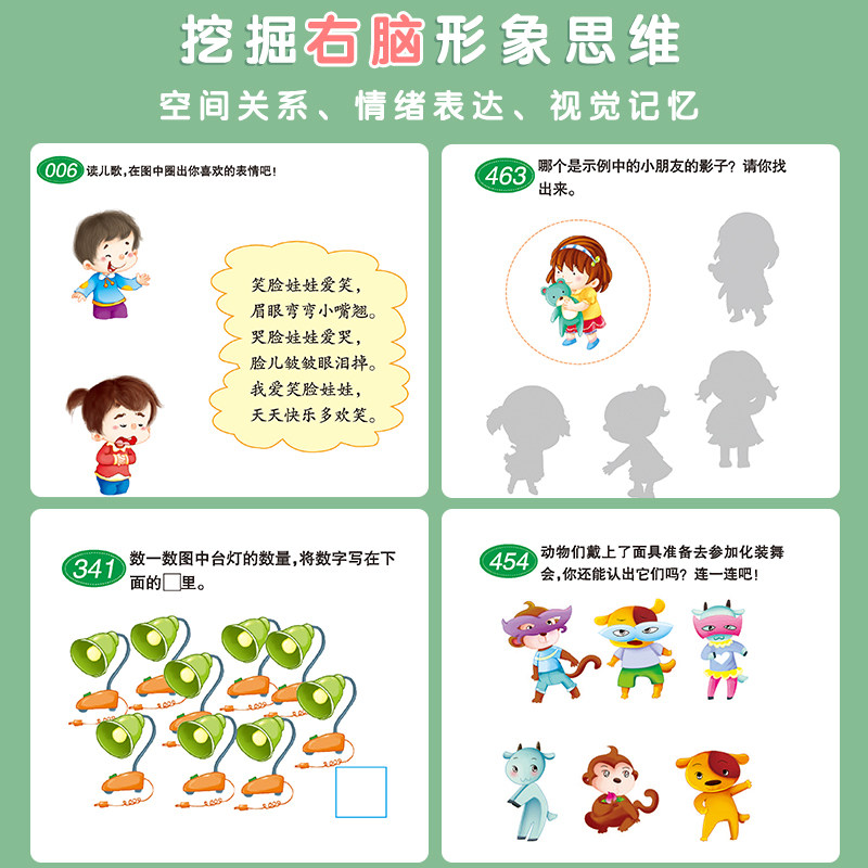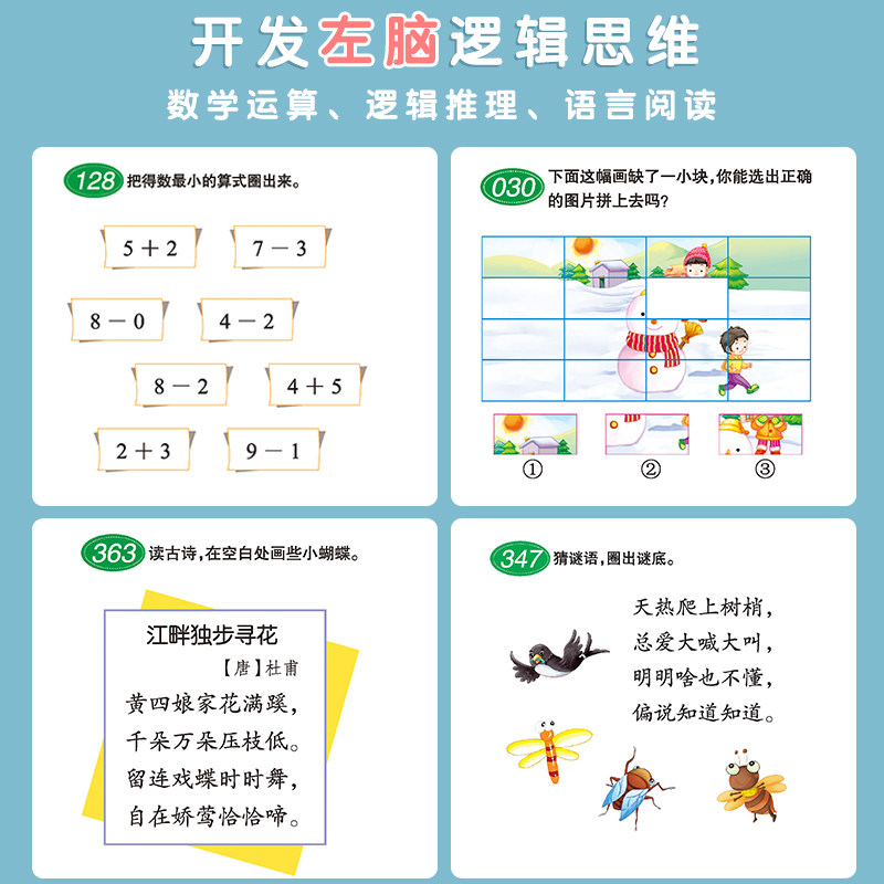 《爱德少儿全脑开发600题》专为3-6岁幼儿设计,是一套系统全面的儿童思维逻辑训练书籍。全书包含600道精心编排的趣味题目,涵盖数学启蒙、逻辑推理、空间想象、观察力与专注力等多个方面,科学促进左右脑均衡发展。内容由浅入深,符合幼儿认知规律,通过游戏化题型激发学习兴趣,帮助孩子在玩中学、学中思。适合家庭早教和幼儿园教学使用,是提升儿童智力潜能、培养良好思维习惯的理想益智绘本,助力宝宝全面发展,为未来学习打下坚实基础。