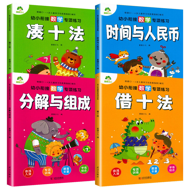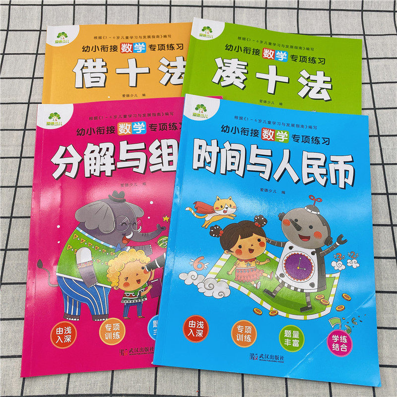新版幼小衔接数学专项训练凑十法借十法分解与组成时间与人民币全套4册学前班幼儿园3-6岁思维专项训练每日一练练习册爱德少儿