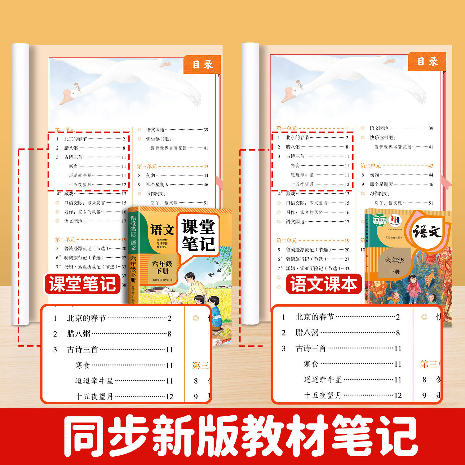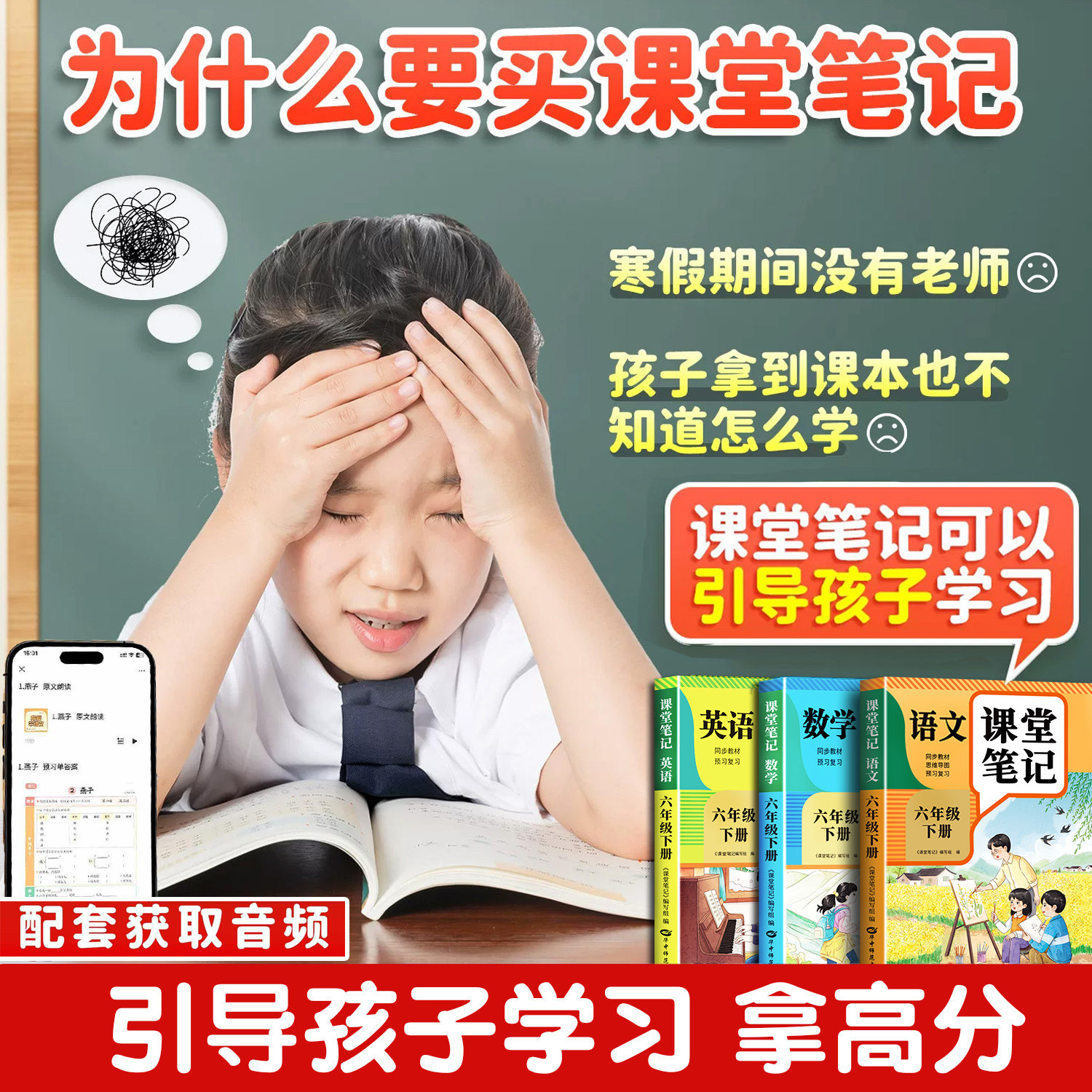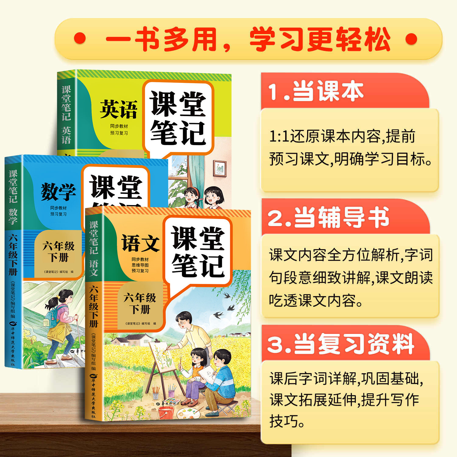 【2026新版】六年级下册课堂笔记(人教版)涵盖语文、数学、英语三科,紧扣最新教材内容,专为小学六年级学生设计。本套笔记系统梳理课本知识点,突出重点难点,配有例题解析与学法指导,助力学生高效预习、复习与随堂巩固。内容编排科学,语言通俗易懂,融合状元学霸学习经验,提供实用解题技巧与知识拓展。同步配套课后练习与单元小结,全面提升学科素养与应试能力。无论是课堂学习还是家庭辅导,都是孩子夯实基础、冲刺优秀的得力助手,是家长信赖、学生喜爱的高效学习资料。