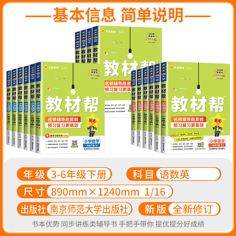 《小学教材帮》是一套专为1-6年级学生设计的人教版、北师大版同步教辅资料,涵盖语文、数学、英语全学科,分上下册配套使用。内容紧扣课本知识点,系统梳理重点难点,配备详细讲解、课堂笔记、同步练习及黄冈名师精编题型,帮助学生高效预习、巩固课堂所学、提升应试能力。书中融入学霸学习方法,注重思维训练与知识拓展,题型丰富,难度梯度合理,适合日常学习与考前复习。无论是基础夯实还是能力提升,《小学教材帮》都是家长辅导、学生自学的得力助手,助力孩子轻松掌握课本内容,稳步提高学习成绩。