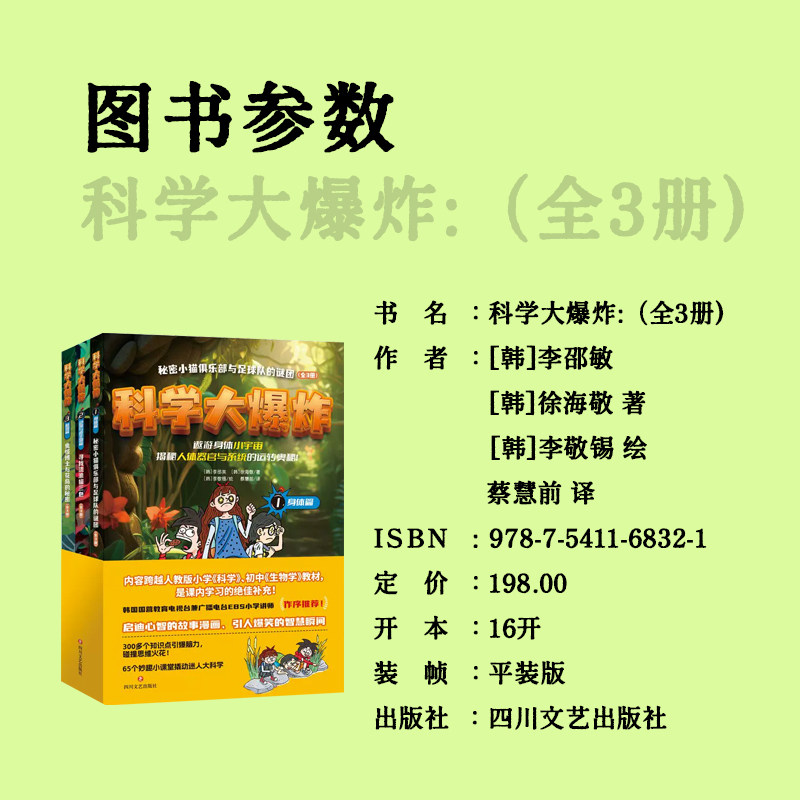 《科学大爆炸(全3册)》是一套专为小学生打造的官方正版科学漫画百科,融合趣味漫画与严谨知识,让孩子在轻松阅读中掌握物理、化学、生物、天文等跨学科通识。全书以生动角色和爆笑剧情串联科学原理,将抽象概念转化为直观画面,激发好奇心与探索欲。内容覆盖课内延伸与课外拓展,符合儿童认知规律,助力提升科学素养与逻辑思维。斯坦威图书精心编绘,图文并茂,语言风趣,是孩子爱不释手的课外读物,也是家庭科学启蒙的理想之选。读得懂、记得住、用得上,让科学不再枯燥!