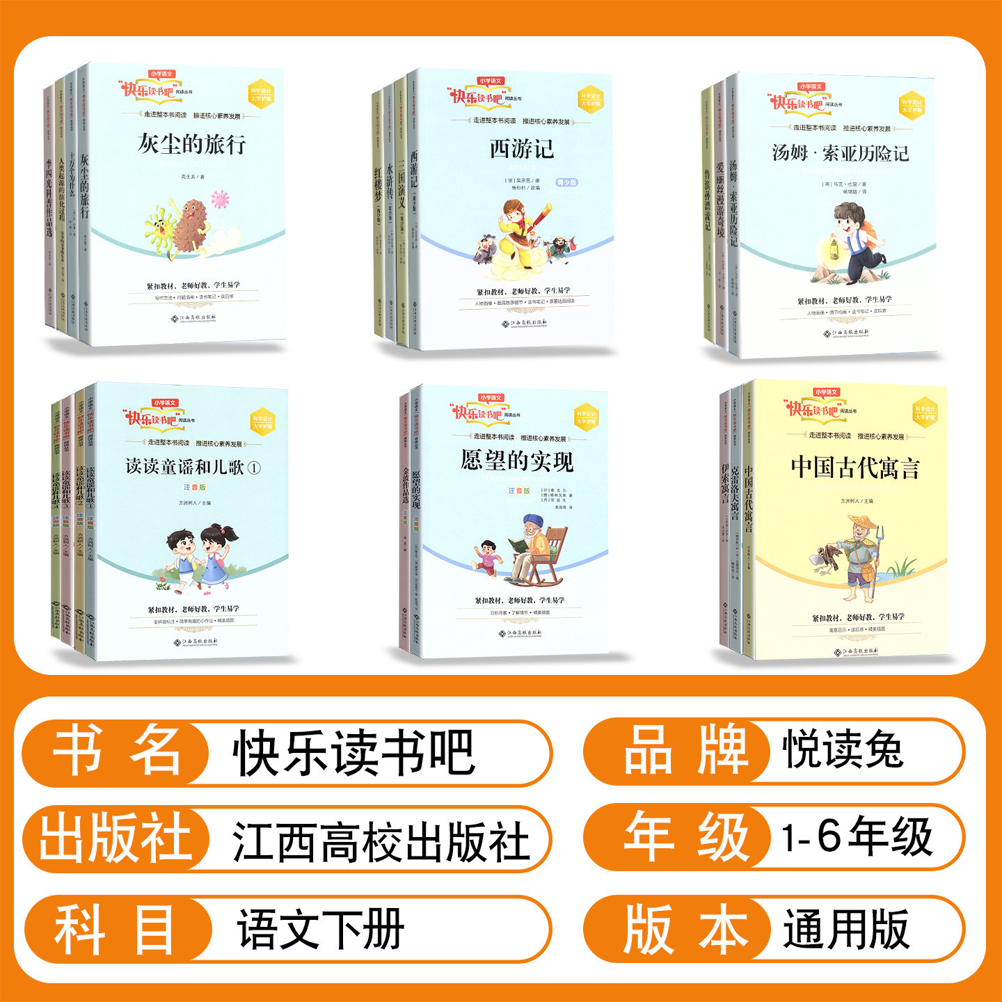 《2026春快乐读书吧·读读童谣和儿歌》是专为小学1-6年级学生设计的课外阅读拓展丛书,由江西高校出版社出版。丛书按年级分册,内容涵盖经典童谣、朗朗上口的儿歌,语言生动活泼,富有韵律感,契合儿童认知特点,助力语言积累与语感培养。同时配套“四大名著”儿童版全套,以通俗易懂的方式呈现《西游记》《三国演义》《水浒传》《红楼梦》精华,激发阅读兴趣,提升文学素养。全书图文并茂,寓教于乐,是小学生课外阅读的理想之选,帮助孩子在快乐阅读中增长知识、陶冶情操。