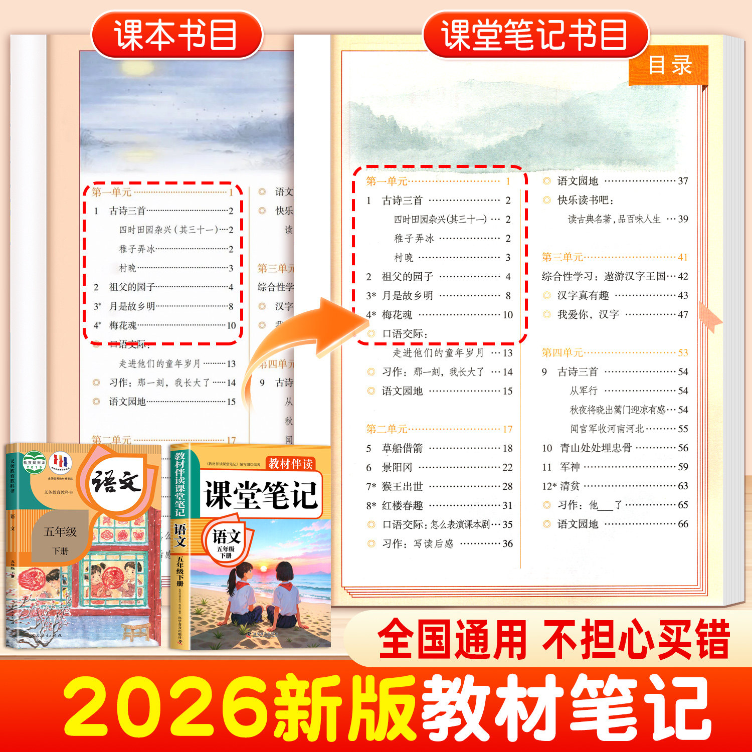 2026年新版《五年级上册下册课堂笔记》是一套专为小学五年级学生打造的人教版同步辅导资料,涵盖语文、数学、英语三科,全面对接教材内容。本书由黄冈一线名师精心编写,结合最新课标要求,系统梳理每课知识点,突出重点难点,配有典型例题解析与拓展练习,帮助学生高效预习、复习与巩固。内容结构清晰,图文并茂,便于理解记忆,是提升学习效率的得力助手。正版保障,品质可靠,适合家长辅导与学生自主学习使用,助力孩子夯实基础、稳步提升学业成绩。