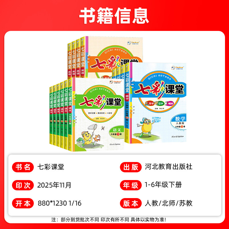 2026新版《七彩课堂》小学五六年级下册及一至四年级上册语文、数学、英语全套教辅,紧扣人教版、北师大版、PEP版教材,全面覆盖小学阶段核心知识点。本书集课文讲解、预习指导、随堂笔记与教材全解于一体,内容详实、结构清晰,帮助学生高效掌握课堂重点。每课配有知识梳理、难点解析、拓展练习及易错点提示,助力学生夯实基础、提升能力。同步课本编排,适配课堂教学节奏,是学生自主学习、家长辅导、教师参考的理想工具书。全彩印刷,图文并茂,激发学习兴趣,让学习更轻松、更高效。