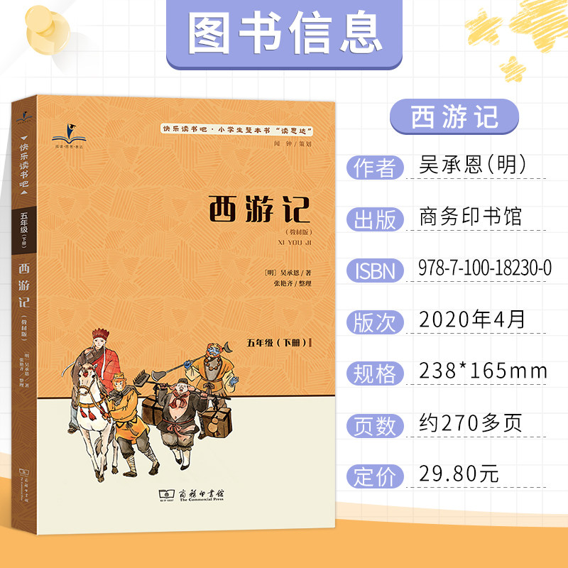 《西游记》是明代作家吴承恩创作的经典神魔小说,作为“四大名著”之一,讲述了唐僧师徒四人西天取经的奇幻旅程。2026年春季,五年级下册“快乐读书吧”推荐整本书阅读,旨在引导学生在“读思达”(阅读、思考、表达)中深入理解作品。通过品读孙悟空的神通广大、猪八戒的憨态可掬、沙僧的忠厚老实以及唐僧的坚定信念,学生不仅能感受精彩的故事情节,还能领悟坚持不懈、团结协作的精神。本书语言生动,想象丰富,适合小学生在老师指导下开展深度阅读,提升语文素养与思辨能力,是传承中华优秀传统文化的重要读本。