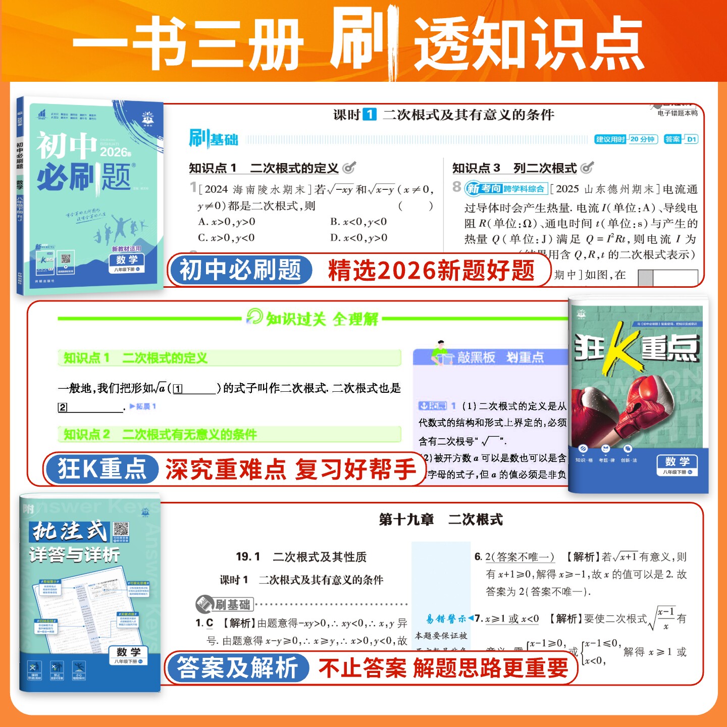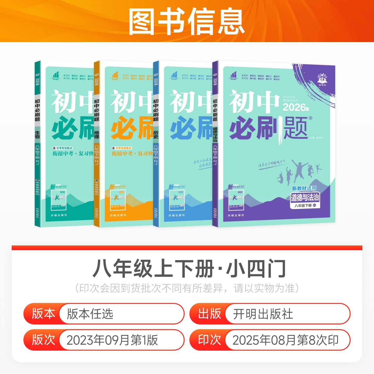 2026春初中必刷题八年级上册下册小四门(政治、历史、地理、生物)全套,涵盖人教版、北师大版教材,同步课本知识,专为初二学生设计。本套练习册紧扣会考与小中考考点,精选典型题型,设置基础巩固、能力提升与综合拓展分层训练,帮助学生夯实基础、突破难点。配套数学、物理、语文、英语等主科专项试卷,全面覆盖学科重点,强化应试能力。题目设计科学,解析详尽,便于学生自主学习与查漏补缺。是八年级学生同步练习、阶段复习和备考冲刺的理想资料,助力提升成绩,迎战中考。