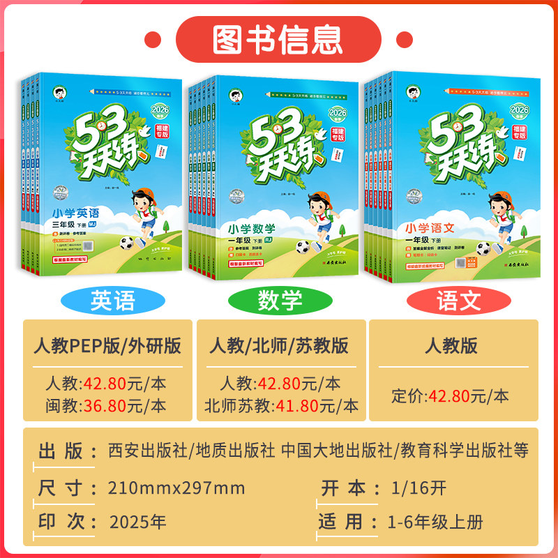 《福建专版2026春新版53天天练》是一套针对小学一二三四五六年级下册的综合性训练习册,内容涵盖语文、数学、英语等多个学科。该习册由人教版、北师大版、苏教版等多版本教材同步配套,包括闽教版和外研版的内容,全面覆盖小学知识点。