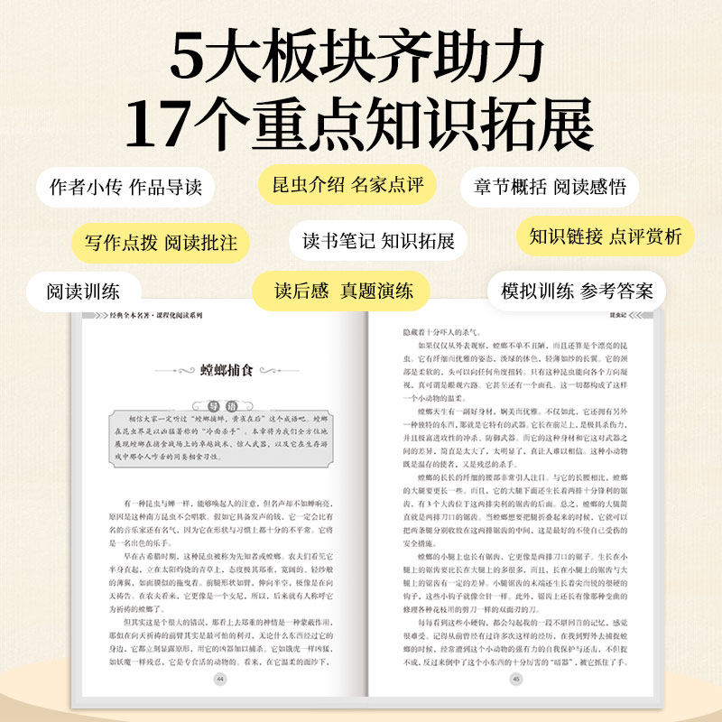 《昆虫记》是法国昆虫学家法布尔倾尽毕生心血创作的科学巨著,以生动细腻的笔触描绘了昆虫世界的奇妙生活,兼具科学性与文学性。八年级下册推荐阅读此书,旨在引导学生观察自然、热爱生命,培养科学探究精神。朱自清在《经典常谈》中也强调经典阅读的重要性,而《昆虫记》正是融合知识、趣味与人文关怀的典范。作为人教版配套课外读物,它不仅帮助学生拓展视野,提升语文素养,更在潜移默化中激发对自然科学的兴趣,是初中生必读的优质名著,值得细细品读与思考。