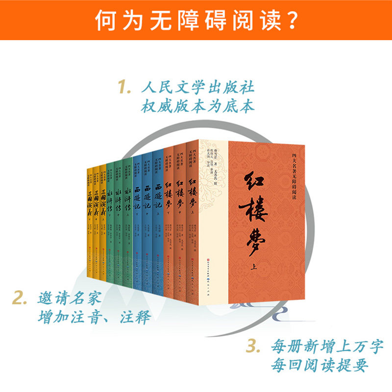 《西游记》《红楼梦》《三国演义》《水浒传》是中国古典文学的四大名著,人民文学出版社推出的“无障碍阅读”版本,完整保留原著无删减内容,专为青少年设计。由知名学者孙大海进行导读,帮助理解深层含义。全书采用白话文注释,语言通俗流畅,扫除阅读障碍,适合小学生、初中生课外阅读。精美装帧,既是学习经典的好帮手,也是馈赠青少年的珍藏礼品。通过这套书,孩子们不仅能领略中华文化的博大精深,还能提升语文素养与阅读能力,是家庭藏书与学校推荐的优质之选。