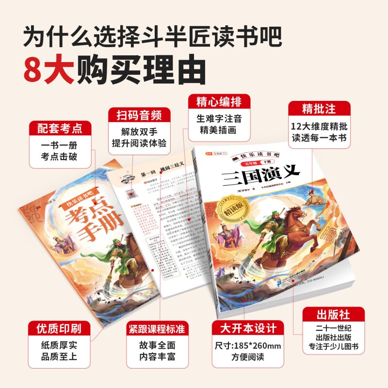 2026年“快乐读书吧”五年级下册推荐阅读的《四大名著》小学生正版原著改编版,专为青少年精心设计,语言通俗易懂,保留原著精华,配以精美插图,提升阅读兴趣。包含《西游记》《红楼梦》《水浒传》《三国演义》四部经典,内容经过适龄化处理,帮助小学生理解人物性格与故事情节。其中《三国演义》参考清代通行版本,还原历史风貌,兼具文学性与教育意义。这套丛书不仅助力语文学习,更培养孩子的传统文化素养与阅读习惯,是五年级学生必读的优质课外读物,让经典在新时代焕发童趣光彩。