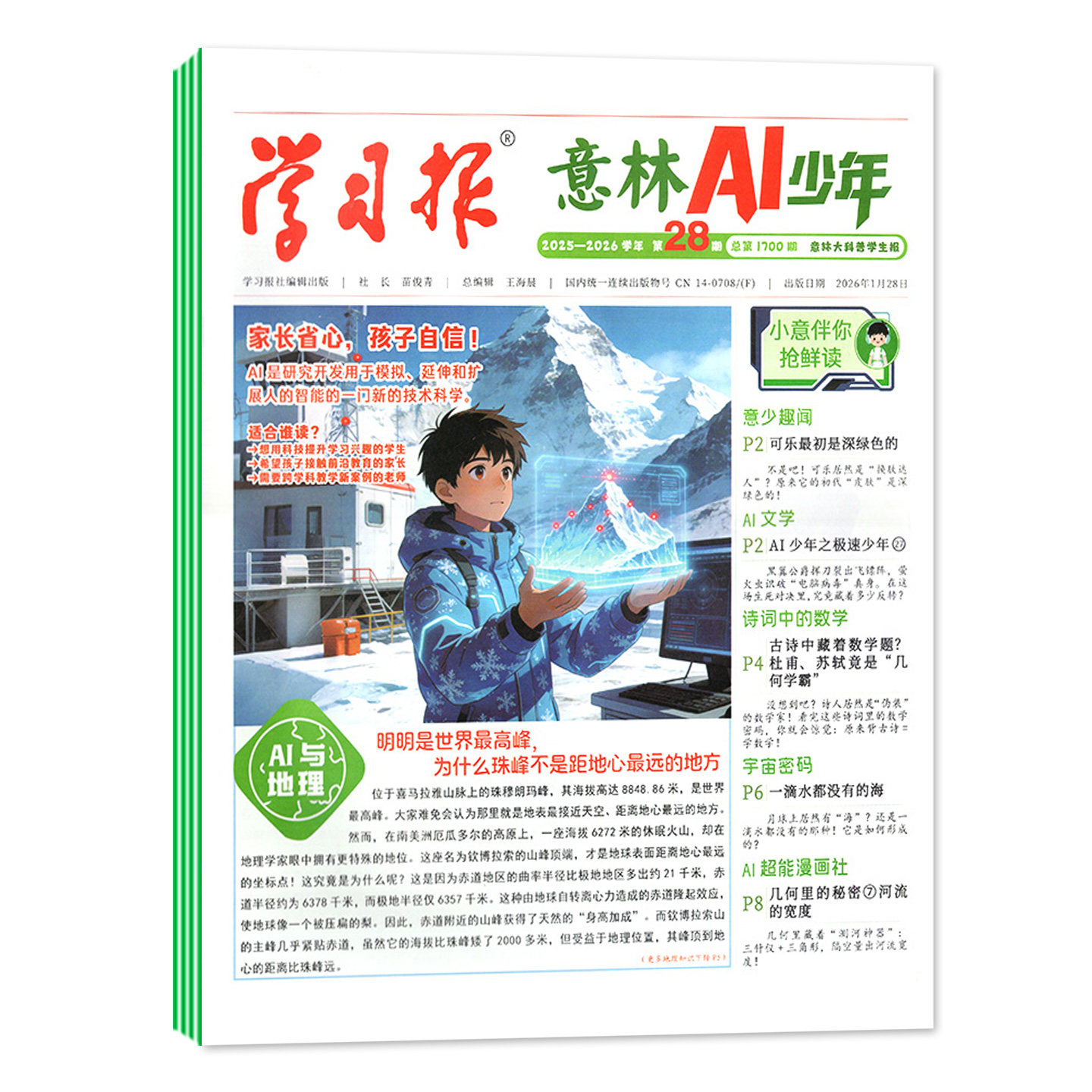 《意林AI少年学习报》2026年3月创刊号专为7-15岁中小学生打造,融合语文、数学、物理、化学等学科知识,结合AI智能互动内容,激发学习兴趣,提升综合素养。本期以“阳光少年”为主题,精选趣味科普、经典阅读、思维训练与生活实践栏目,寓教于乐,助力孩子全面发展。报纸语言生动、图文并茂,兼顾知识性与可读性,适合自主阅读与家庭共学。另有1-2月合订本、半年及全年订阅可选,过刊单本亦可单独购买,方便灵活。作为新时代青少年成长读物,《意林AI少年学习报》致力于培养爱思考、有情怀、敢创新的阳光少年。