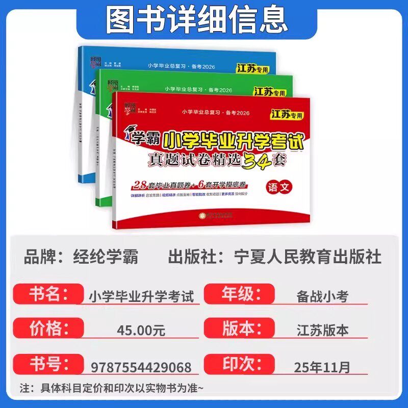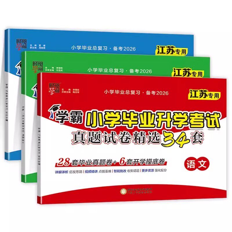 《2026春学霸小学毕业升学考试真题试卷精选34套·江苏专版》由宁夏人民教育出版社出版,新华正版发行,专为江苏地区小学毕业生升学备考设计。本书精选34套高质量真题试卷,紧扣江苏最新考纲与教材同步,涵盖语文、数学、英语三科核心考点,题型全面、难度适中,注重基础知识巩固与综合能力训练。每套试卷均附详细解析,帮助学生查漏补缺、掌握答题技巧。作为权威教辅资料,本书由一线名师精心编写,内容科学严谨,是小学生冲刺理想中学、提升学业成绩的理想选择,助力学子从容应对升学考试,实现学业新跨越。