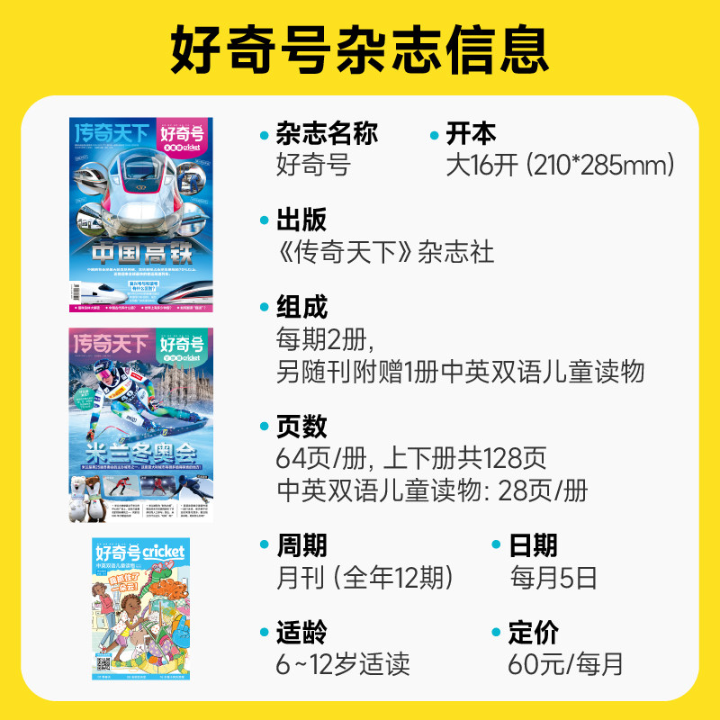 《好奇号》杂志专为6-12岁青少年打造,是一本融合科普知识与通识教育的中英双语期刊。内容涵盖科学、技术、自然、历史、文化等多领域,以生动有趣的故事和精美插图激发孩子的好奇心与探索欲。每期设置主题式深度阅读,兼顾知识性与趣味性,助力提升综合素养与双语能力。支持2025/2026年单期、季度或全年组合订阅,灵活选择,满足个性化需求。全国包邮,安全便捷。作为权威科普品牌,《好奇号》致力于培养孩子的科学思维与全球视野,是中小学生课外阅读的理想之选,陪伴孩子在知识的海洋中快乐成长。